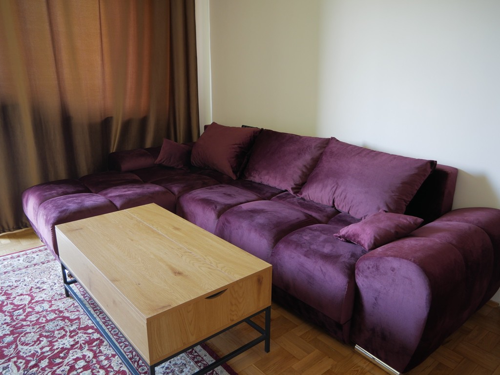 Głęboki bordowy welur nadaje pomieszczeniu charakteru, a szerokie siedziska zapewniają komfort codziennego odpoczynku.