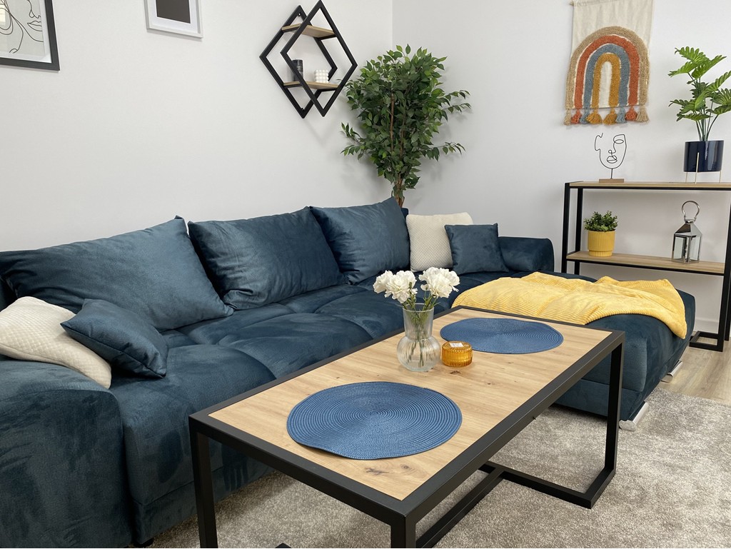 Lazurowy welur nadaje wnętrzu świeżości i spokoju, a geometryczna forma porządkuje przestrzeń w stylu modern i scandi.
