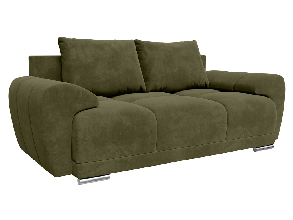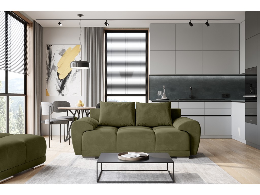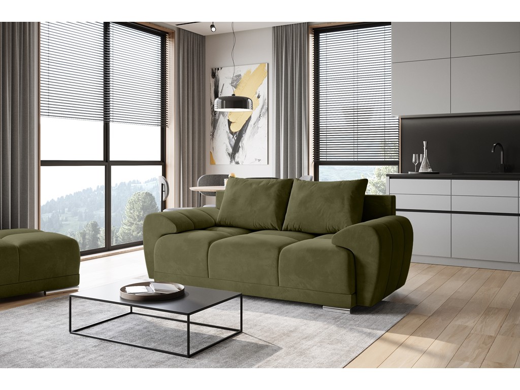 Sofa Bego 2 w kolorze oliwkowym wnosi do wnętrza naturalny ton i subtelną elegancję.