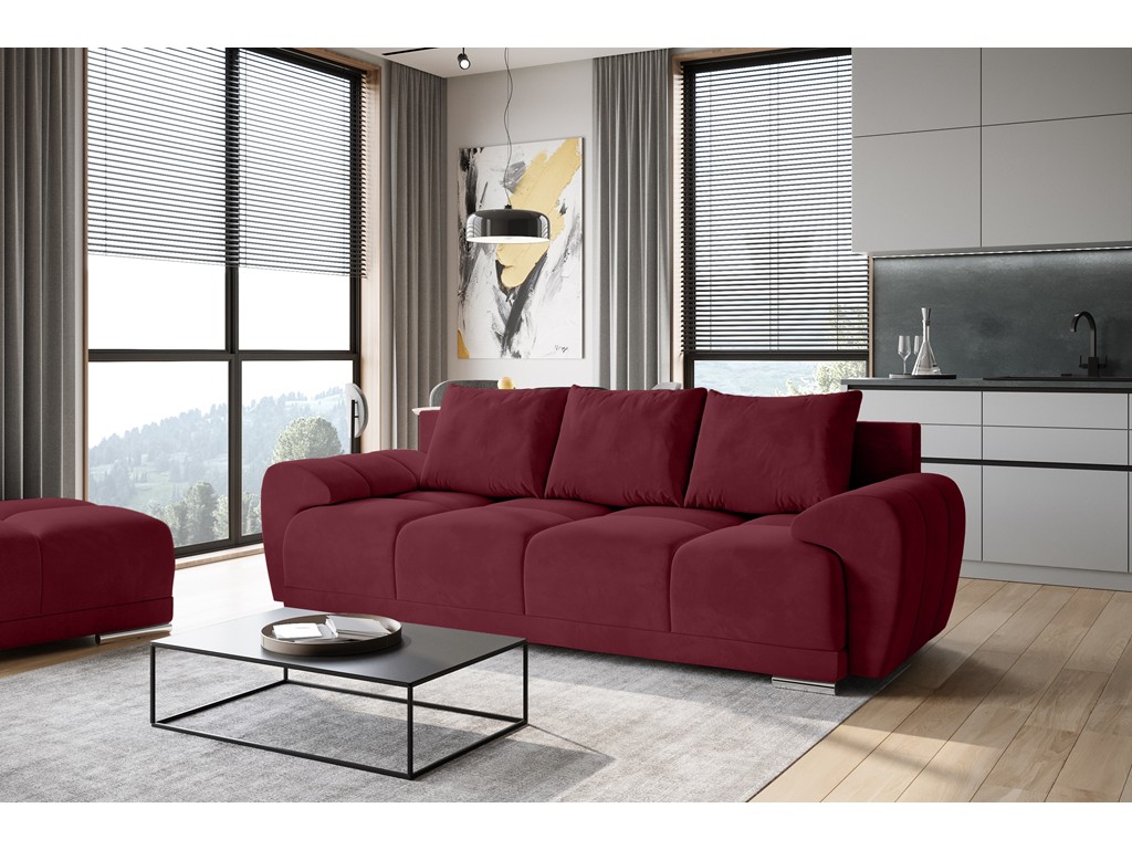 Sofa Bego 3 w głębokim, czerwonym odcieniu to propozycja dla osób lubiących energię i charakter we wnętrzu. Miękki welur Monolith 59 pięknie odbija światło i nadaje salonowi ciepła. Model posiada funkcję spania oraz pojemnik na pościel, łącząc elegancję z praktycznym użytkowaniem. Dostawa 21-30 dni. ⟵Zobacz całą kolekcję sof