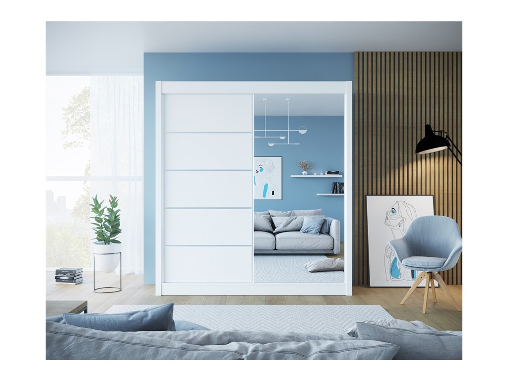 Szafa Bueno 1 180 biały mat to szafa przesuwna z lustrem i dekoracyjnymi szprosami, która wprowadza do wnętrza nowoczesny i jasny akcent. Minimalistyczna forma i aluminiowe uchwyty umożliwiają łatwe dopasowanie do różnych aranżacji, a przemyślane wnętrze zapewnia maksymalną pojemność.