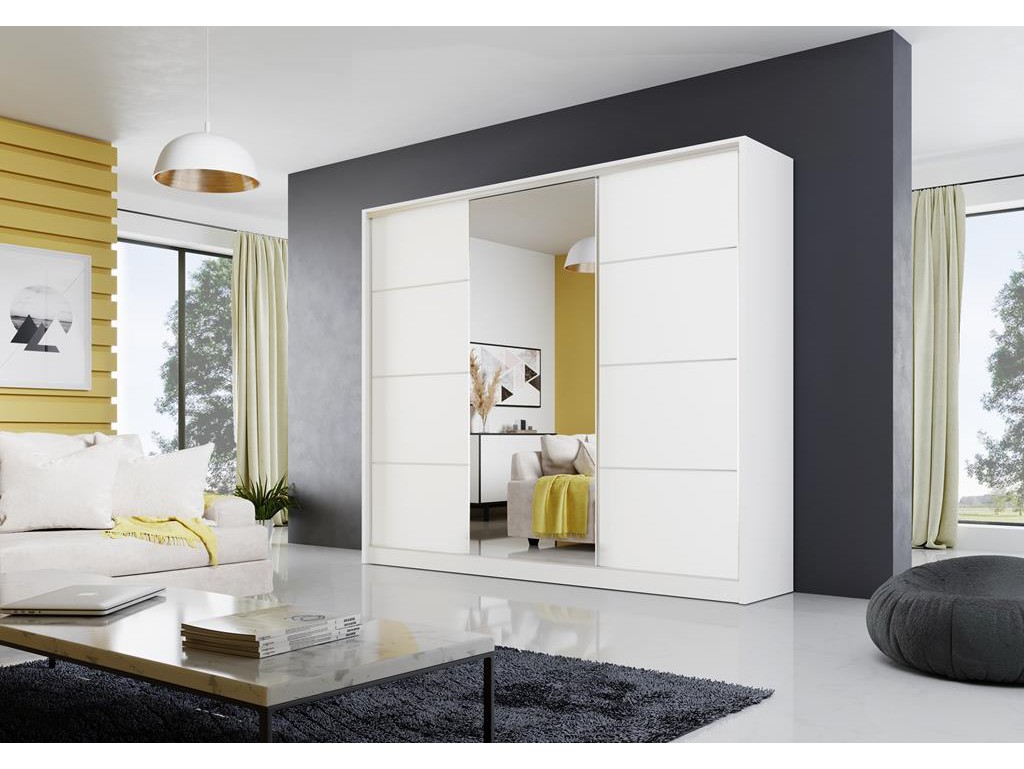 Szafa przesuwna Meblo 4 w rozmiarze 250 cm w kolorze biały mat to nowoczesny i elegancki mebel do przestronnej sypialni lub przedpokoju. Centralne lustro optycznie powiększa przestrzeń, a boczne fronty ze szprosami chromowanymi wprowadzają subtelny akcent dekoracyjny. Solidny system przesuwny Laguna i aluminiowe uchwyty listwowe zapewniają komfort codziennego użytkowania.