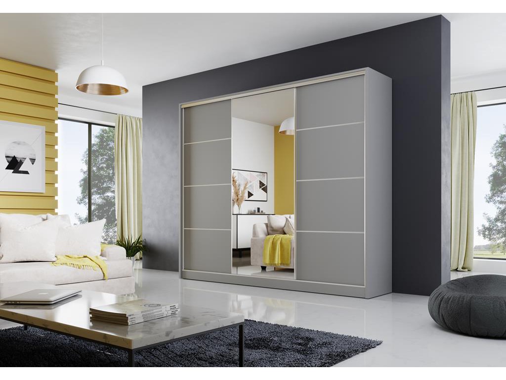 Szafa przesuwna Meblo 4 w rozmiarze 250 cm w odcieniu szary mat to nowoczesna propozycja do przestronnych wnętrz. Centralne lustro optycznie powiększa przestrzeń, a boczne fronty ze szprosami podkreślają minimalistyczny design. Pojemna konstrukcja pozwala wygodnie przechowywać garderobę, obuwie i akcesoria, a trwała płyta laminowana 16 mm z systemem przesuwnym zapewnia komfort codziennego użytkowania.