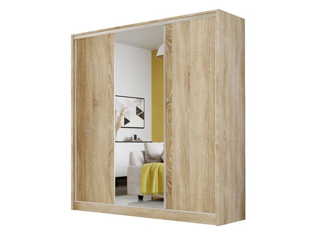 Szafa przesuwna Meblo 1 w rozmiarze 200 cm w kolorze sonoma wprowadza do wnętrza jasny, naturalny ton drewna, tworząc ciepłą i harmonijną przestrzeń. Centralne lustro optycznie powiększa pomieszczenie, a trzydrzwiowy system przesuwny zapewnia wygodny dostęp do całego wnętrza. Model oferuje półki, przegrody i drążek, umożliwiając funkcjonalną organizację garderoby.
