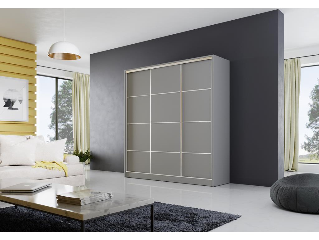 Szafa Meblo 3 w rozmiarze 200 cm w neutralnym kolorze szary mat wprowadza do wnętrza nowoczesny, neutralny akcent. Drzwi przesuwne zapewniają wygodny dostęp do pojemnego wnętrza z półkami, przegrodami i drążkiem na ubrania. Aluminiowe uchwyty listwowe oraz subtelne szprosy chromowane nadają meblowi elegancji, a uniwersalny kolor szary dobrze komponuje się z różnymi aranżacjami.