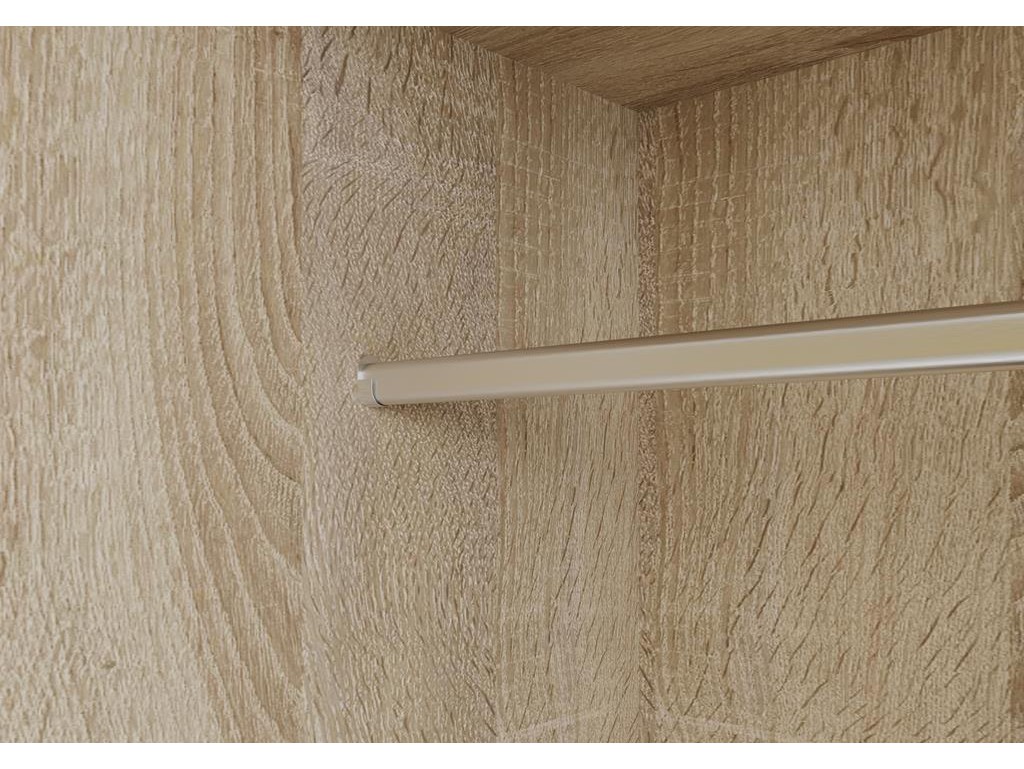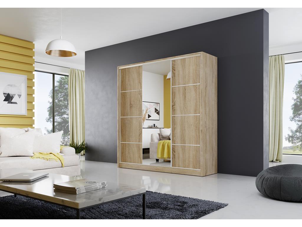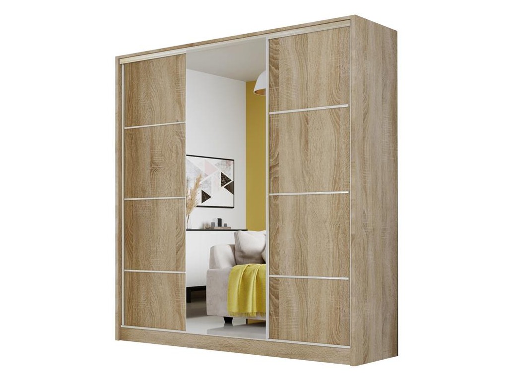Szafa przesuwna Meblo 4 w rozmiarze 200 cm w jasnym kolorze sonoma to pojemny mebel, który wprowadza do wnętrza ciepły, naturalny akcent drewna. Centralne lustro optycznie powiększa przestrzeń, a trzy drzwi przesuwne zapewniają wygodny dostęp do przestronnego wnętrza. Model umożliwia komfortowe przechowywanie odzieży i dodatków, a opcjonalne oświetlenie LED i szuflady zwiększają funkcjonalność.