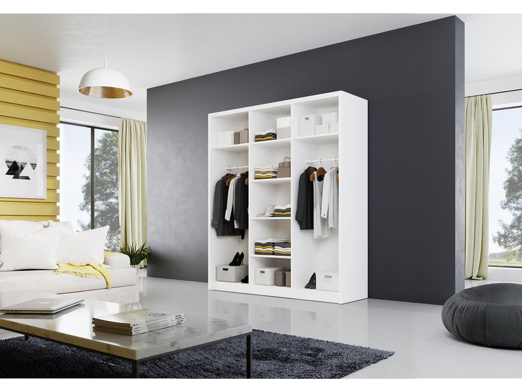 - Półki pionowe, przegródki i drążek na ubrania