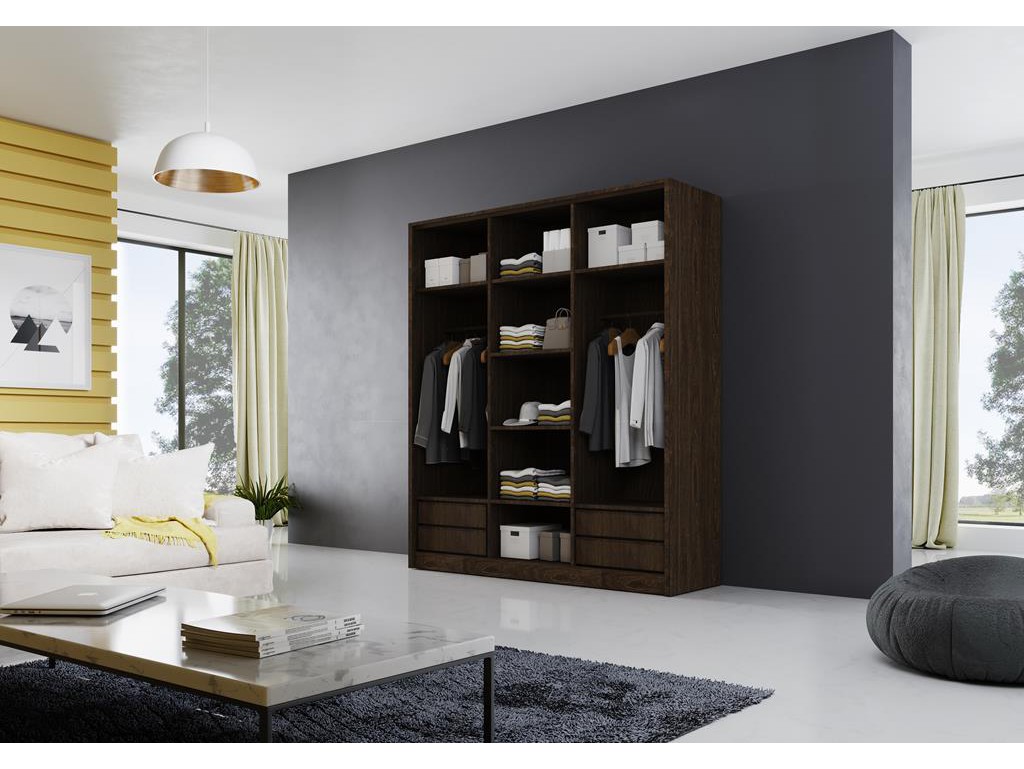 - Półki pionowe, przegródki i drążek na ubrania