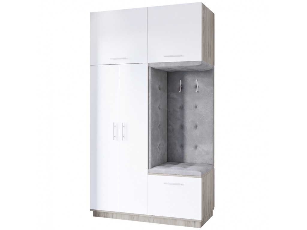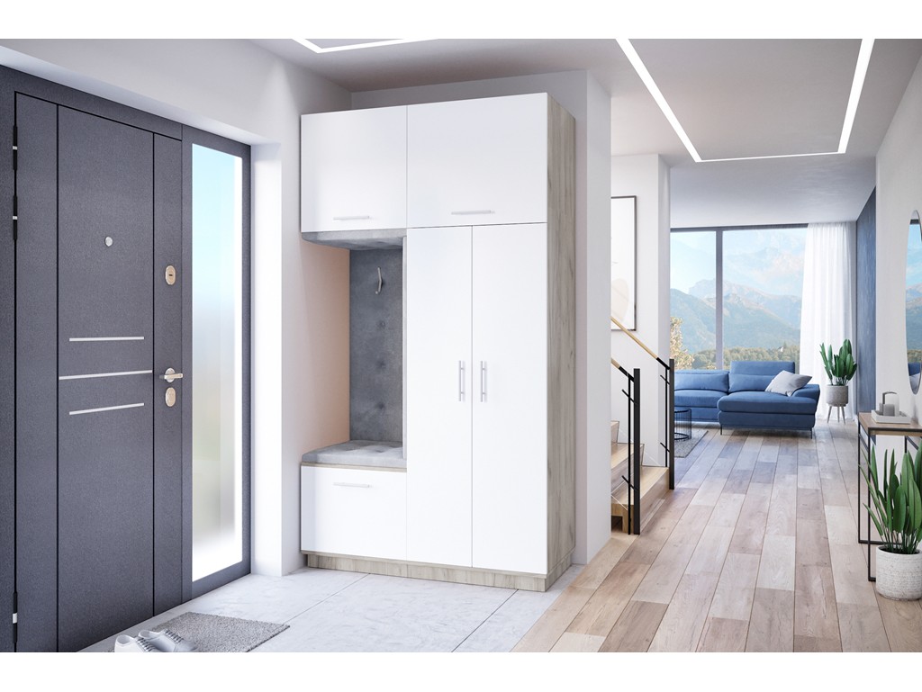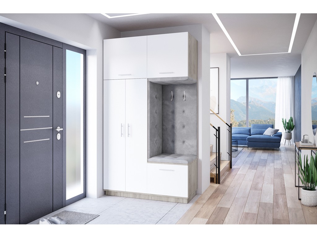 Garderoba Milo 3 w rozmiarze 150 cm z korpusem w ciepłym kolorze szary Craft z białym, matowym frontem to ponadczasowa i pojemna szafa do korytarza, która łączy elegancję z funkcjonalnością. Wnęka z siedziskiem pełni praktyczne miejsce do zakładania obuwia.