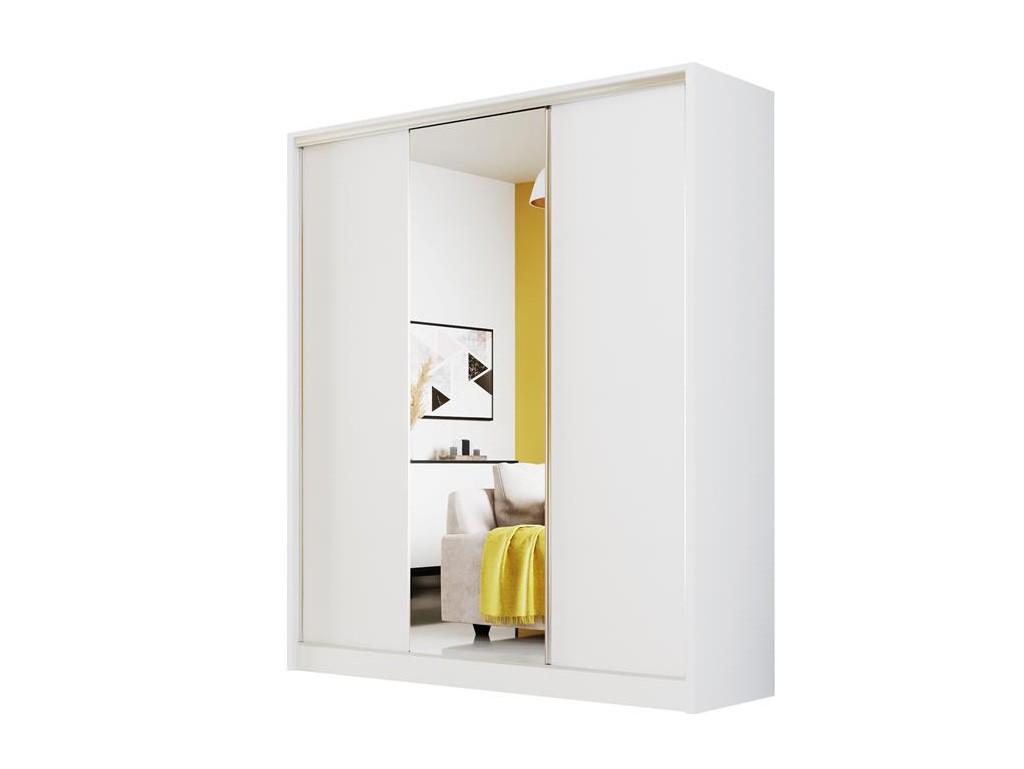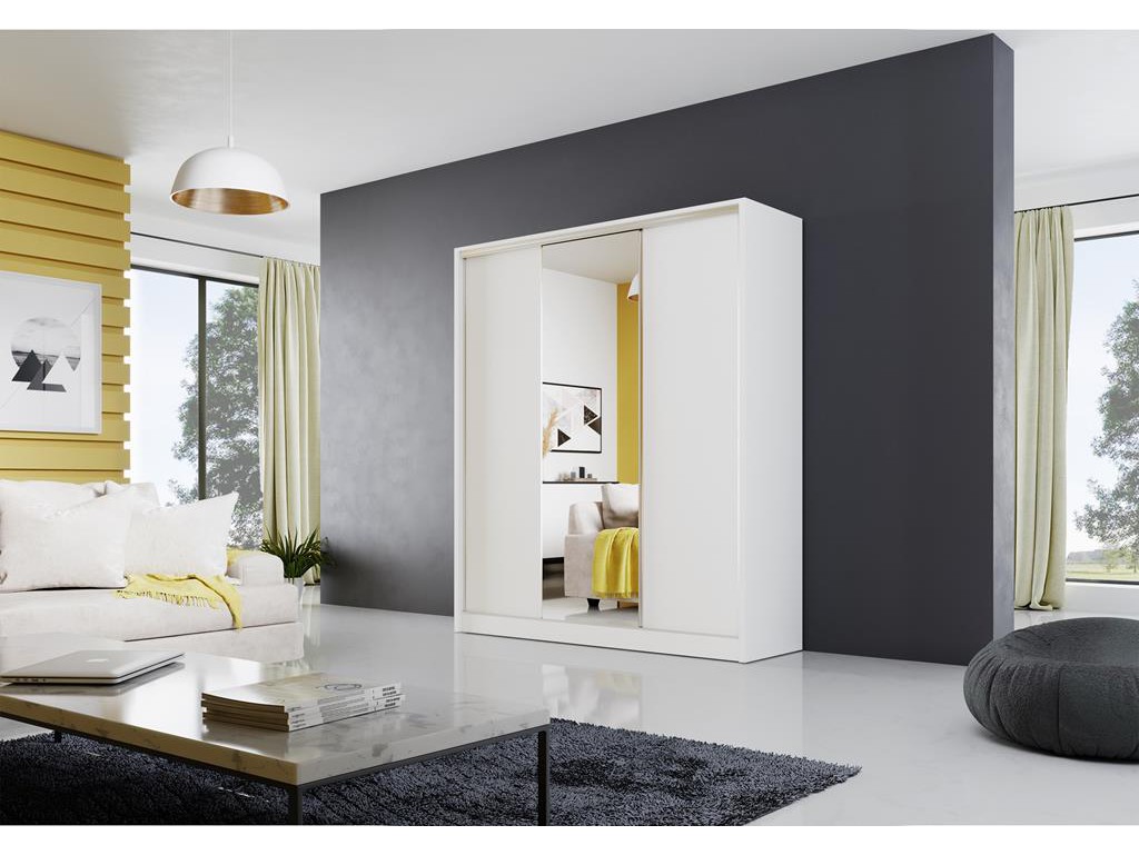 Szafa przesuwna Meblo 1 w rozmiarze 180 cm w jasnej kolorystyce biały mat to uniwersalny mebel do nowoczesnych wnętrz. Lustro na środkowym froncie optycznie powiększa przestrzeń, a dwa gładkie fronty zapewniają harmonijny wygląd. Drzwi przesuwne pozwalają wygodnie korzystać z półek pionowych, przegrody i drążka na ubrania wiszące.
