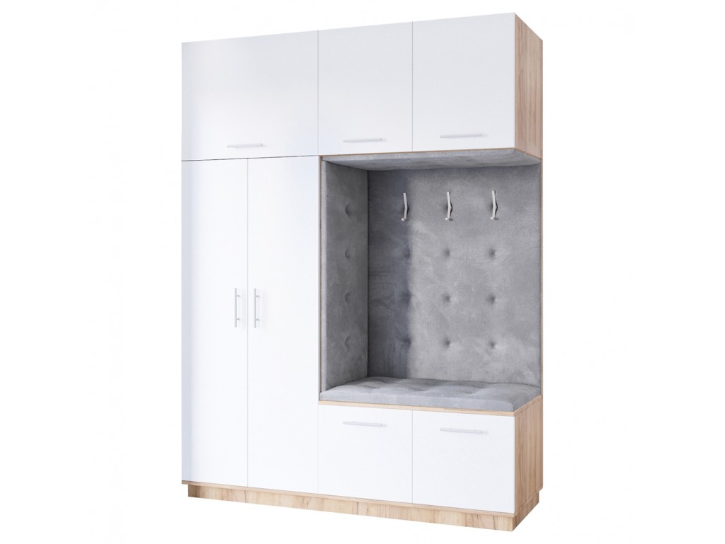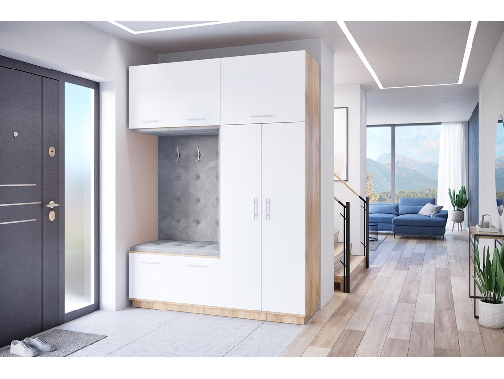 Garderoba Milo 3 w rozmiarze 180 cm z białym matowym frontem i korpusem w kolorze złoty Craft to ponadczasowa, pojemna szafa do korytarza, która łączy elegancję z funkcjonalnością. Tapicerowana wnęka z siedziskiem pełni praktyczne miejsce do zakładania obuwia, a liczne półki i szafki zapewniają wiele przestrzeni do przechowywania.