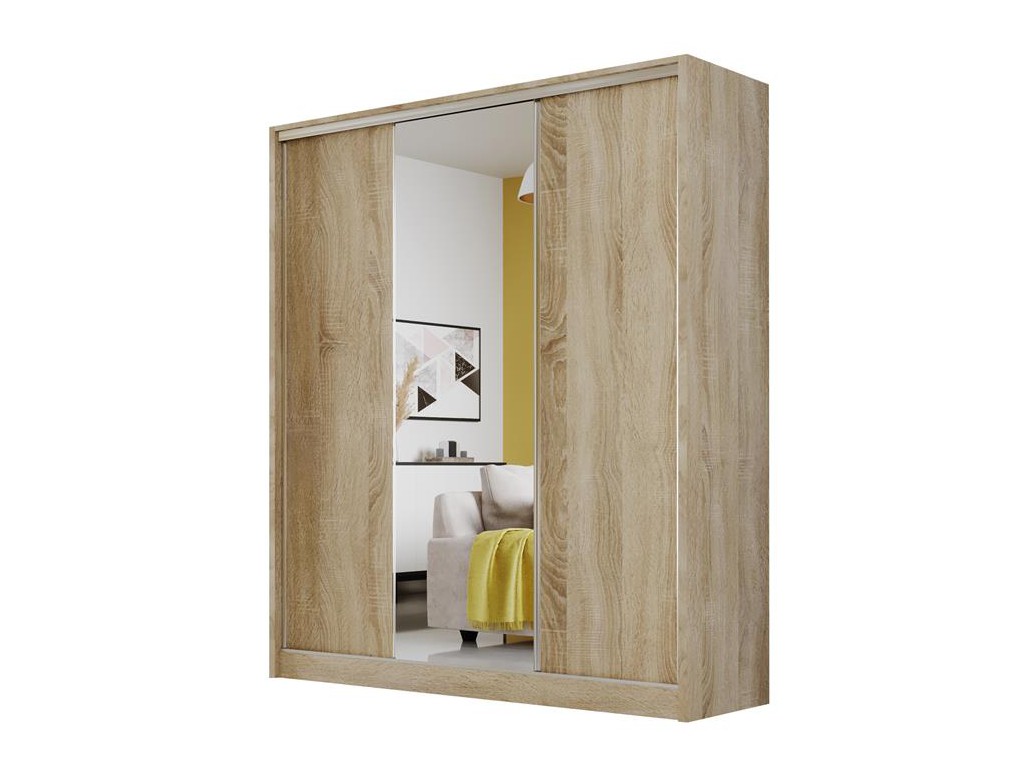 Szafa przesuwna Meblo 1 w rozmiarze 180 cm i jasnym kolorze sonoma to ciepły, naturalny model idealny do wnętrz w stylu skandynawskim i klasycznym. Lustro na środkowym froncie optycznie powiększa przestrzeń, a drzwi przesuwne i funkcjonalne wnętrze z półkami pionowymi, przegrodami i drążkiem na ubrania ułatwiają codzienne użytkowanie. Jasna sonoma wprowadza przyjazną atmosferę, a mebel dostarczany jest w paczkach do samodzielnego montażu.