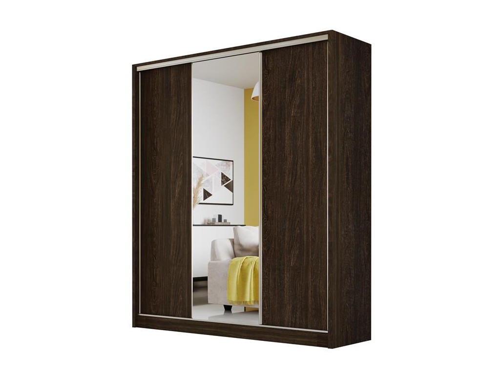 Szafa Meblo 1 w rozmiarze 180 cm w eleganckim odcieniu wenge to wyrazisty mebel, który wprowadza do wnętrza przytulny, ciemny akcent. Lustro na środku optycznie powiększa przestrzeń, a dwa gładkie fronty nadają minimalistyczny charakter. Drzwi przesuwne zapewniają wygodny dostęp do wnętrza wyposażonego w półki pionowe, przegrody i drążek na ubrania wiszące. Model sprawdzi się zarówno w przestronnych salonach, jak i przytulnych sypialniach, oferując funkcjonalność połączoną z designerskim wyglądem.