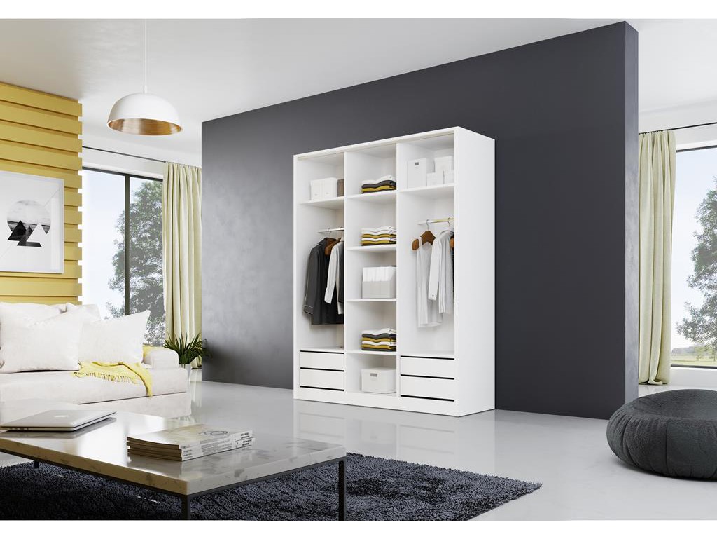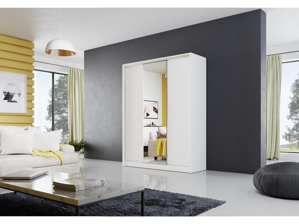Szafa przesuwna Meblo 1 150 biały mat to lekki wizualnie model z centralnym lustrem i dwoma gładkimi frontami, idealny do nowoczesnych, jasnych wnętrz. Matowe wykończenie rozświetla pomieszczenie, a przemyślany układ wnętrza zapewnia wygodną organizację przestrzeni. Pojemna szafa dopasowuje się do różnych aranżacji, oferując funkcjonalność w codziennym użytkowaniu.