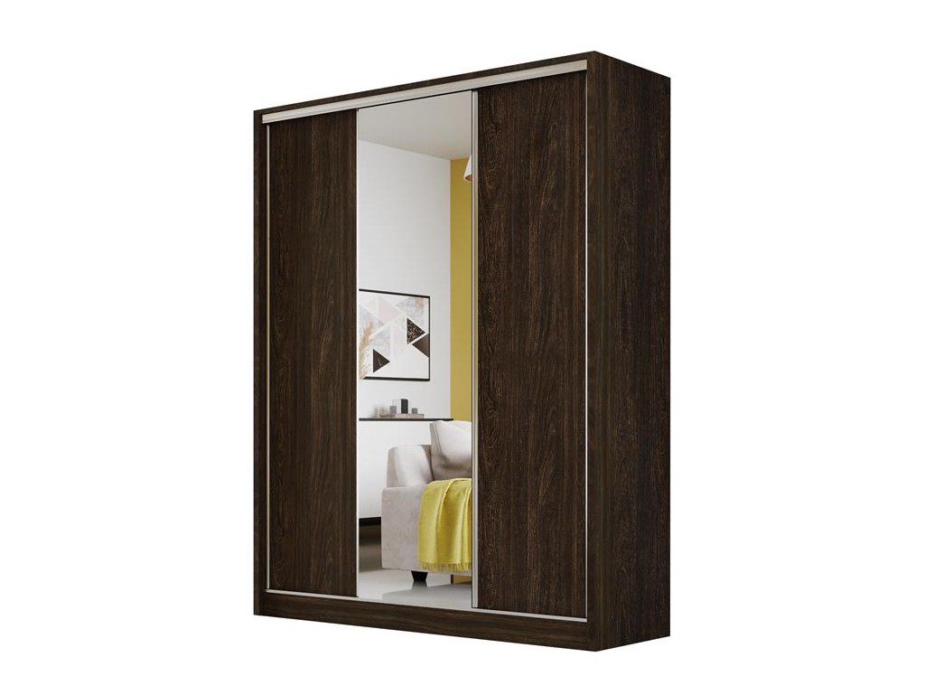 Szafa Meblo 1 150 wenge z jednym lustrem na środkowym froncie łączy nowoczesny wygląd z funkcjonalnym układem wnętrza. Troje drzwi przesuwnych kryją półki i drążek, zapewniając praktyczne miejsce do przechowywania. Model idealny do sypialni, garderoby lub przedpokoju - gotowy do samodzielnego montażu.