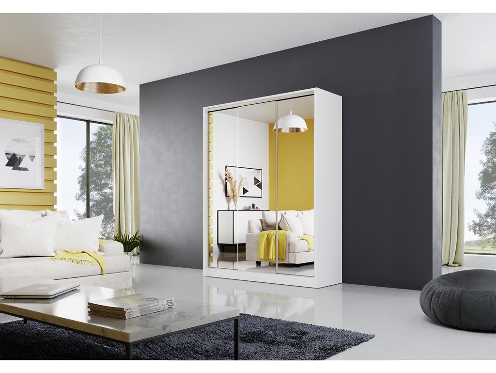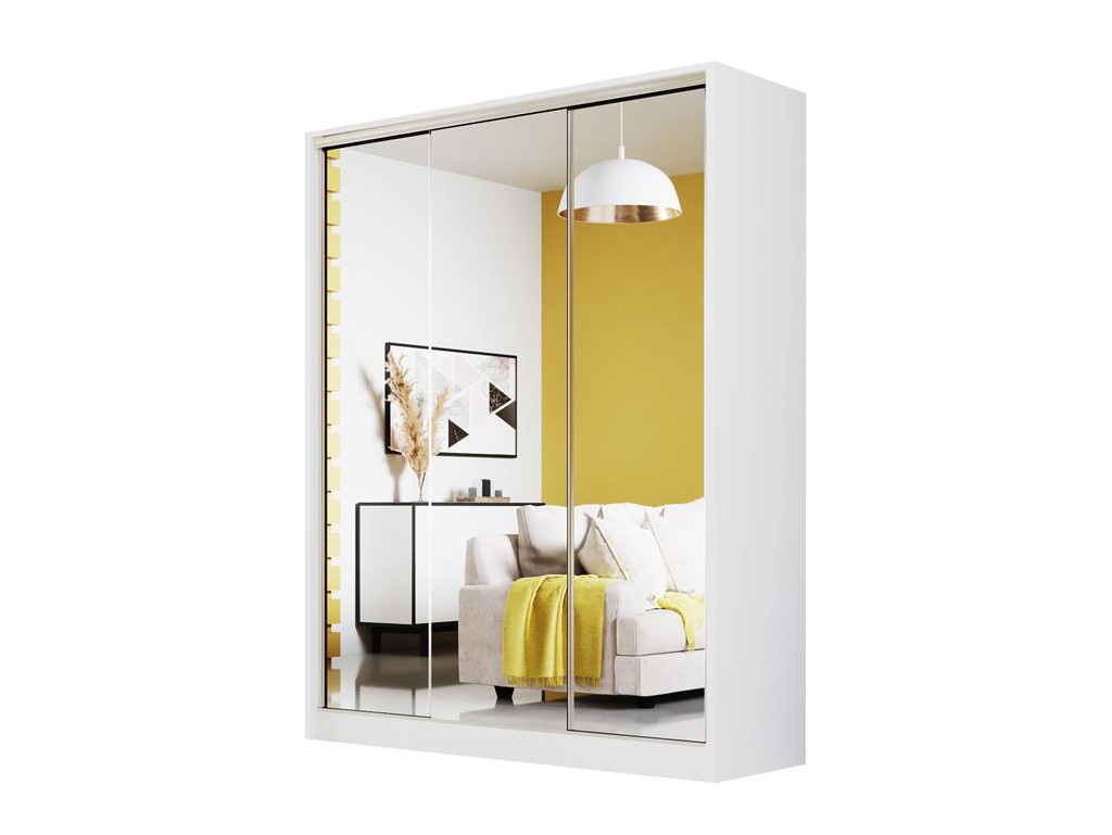 Szafa Meblo 2 150 biały mat to jasny, minimalistyczny model z dużymi lustrami na wszystkich frontach, które optycznie powiększają wnętrze. Matowe białe wykończenie podkreśla lekkość mebla, a funkcjonalny układ półek i drążków umożliwia wygodne przechowywanie garderoby. Doskonale komponuje się w nowoczesnych i skandynawskich wnętrzach.
