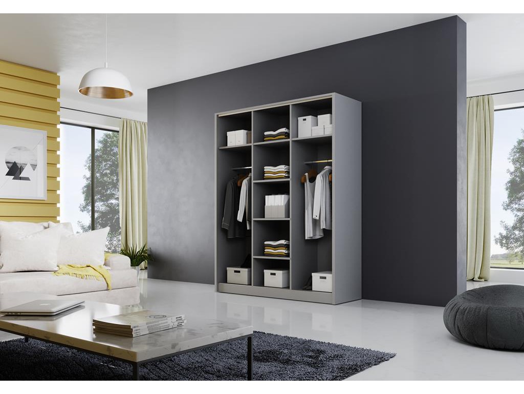 Szafa Meblo 4 150 cm w odcieniu szary mat wprowadza do wnętrza nowoczesny i minimalistyczny charakter. Drzwi przesuwne zapewniają wygodny dostęp do przestronnego wnętrza, wyposażonego w półki, przegrody i drążek na ubrania wiszące. Chromowane detale i aluminiowe listwy podkreślają elegancki wygląd mebla, a opcjonalne szuflady i oświetlenie LED zwiększają funkcjonalność zgodnie z indywidualnymi potrzebami. ⟵Zobacz całą kolekcję szaf Meblo