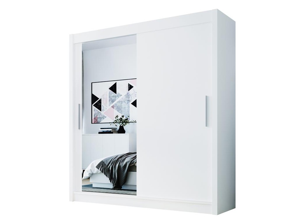 Szafa Doti 1 180 cm w odcieniu biały mat wnosi do wnętrza jasny i nowoczesny akcent, który optycznie powiększa przestrzeń. Lustro na jednym z frontów ułatwia codzienne korzystanie, a drugie gładkie skrzydło subtelnie równoważy całość. Dwudrzwiowy system przesuwny zapewnia wygodny dostęp do przestronnego wnętrza z półkami i drążkiem na ubrania wiszące. ⟵Zobacz całą kolekcję szaf Doti