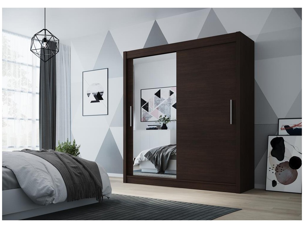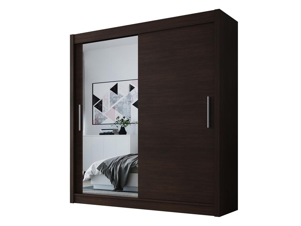 Szafa przesuwna Doti 1 180 cm w odcieniu choco wnosi do wnętrza przytulny, ciepły akcent ciemnego drewna. Lustro na froncie powiększa optycznie przestrzeń, a gładki drugi front harmonijnie dopełnia nowoczesny charakter mebla. Dwudrzwiowy system przesuwny zapewnia wygodny dostęp do przestronnego wnętrza z półkami i drążkiem na ubrania wiszące. ⟵Zobacz całą kolekcję szaf Doti