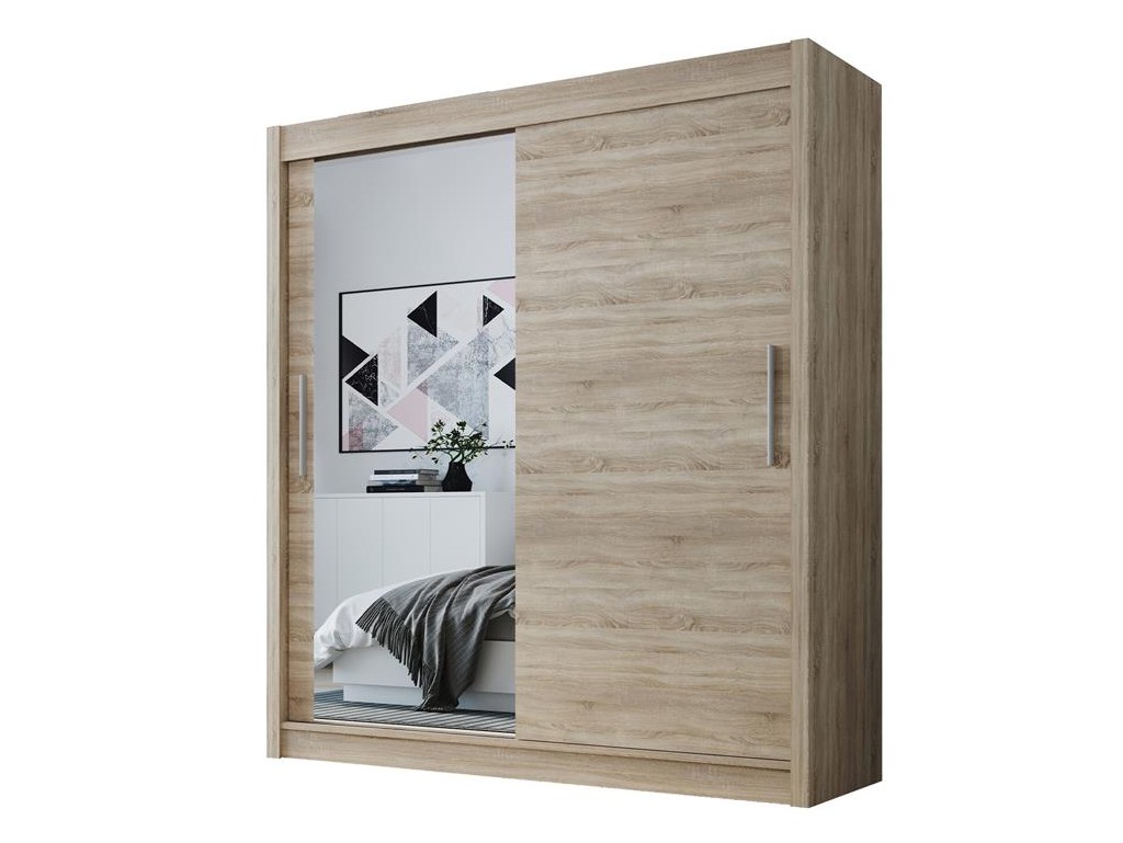 Szafa przesuwna Doti 1 150 cm sonoma to funkcjonalny mebel do sypialni, przedpokoju lub pokoju młodzieżowego. Jasne wybarwienie sonoma dodaje wnętrzu lekkości, a lustro na jednym froncie ułatwia codzienne korzystanie i podkreśla minimalistyczny charakter gładkiego skrzydła. ⟵Zobacz całą kolekcję szaf Doti
