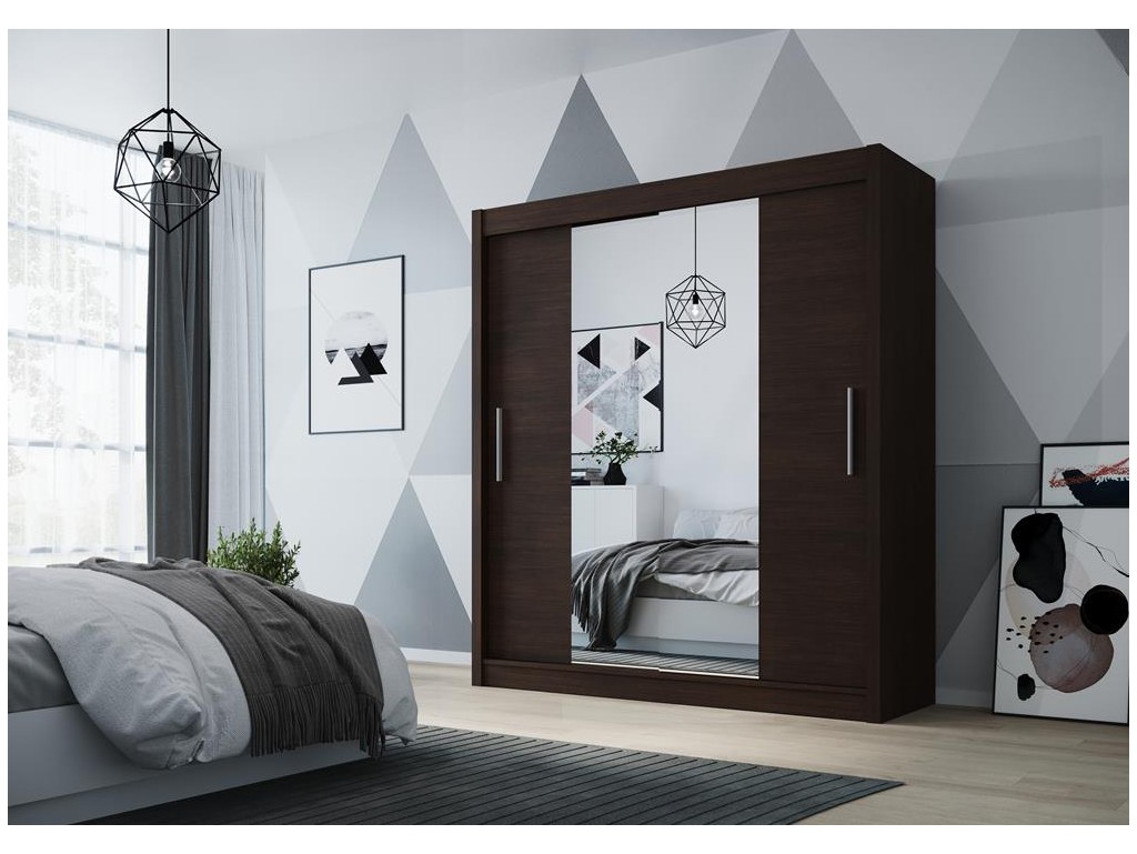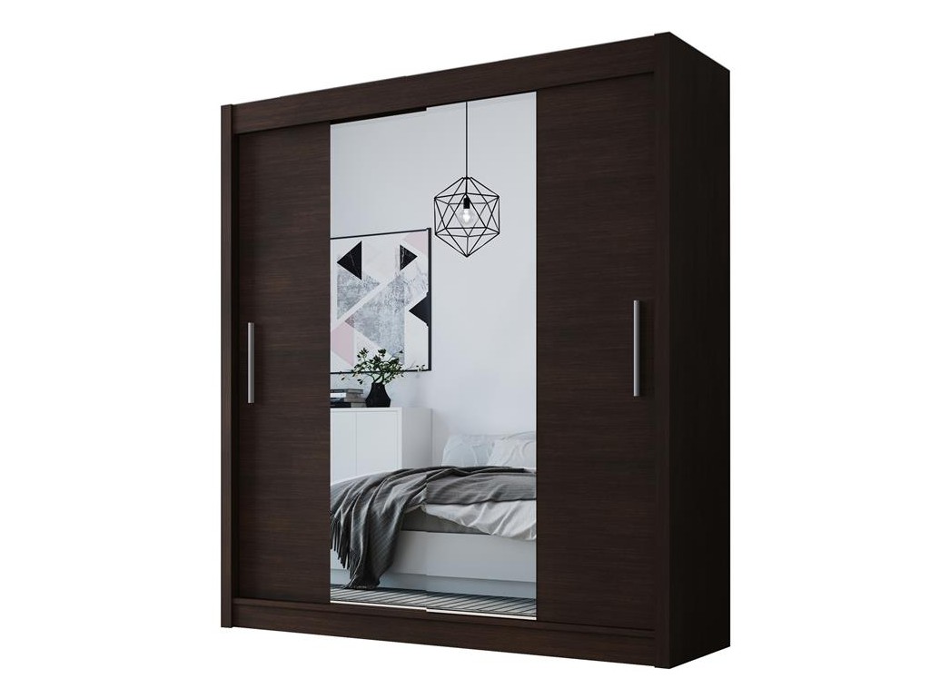 Szafa przesuwna Doti 2 150 cm w eleganckim wybarwieniu choco łączy głęboki odcień drewna z funkcjonalnym wnętrzem. Centralne lustro optycznie powiększa przestrzeń, a gładkie fronty nadają minimalistyczny charakter. Przemyślany system drzwi przesuwnych oraz pojemne wnętrze z półkami i drążkiem zapewniają wygodę użytkowania w sypialni, garderobie lub przedpokoju.⟵Zobacz całą kolekcję szaf Doti