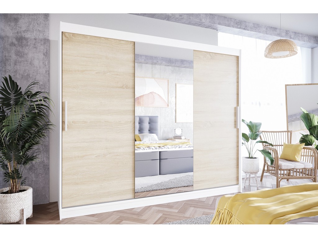 Szafa Lolo I biały mat/sonoma 250 to nowoczesna szafa przesuwna z trojgiem drzwi i centralnym lustrem, idealna do sypialni lub garderoby. Jasne fronty łączą subtelny biały mat z naturalnym odcieniem drewna sonoma, a przestronne wnętrze ułatwia organizację ubrań. Dostawa w standardzie 5-12 dni.⟵Zobacz całą kolekcję szaf Lolo