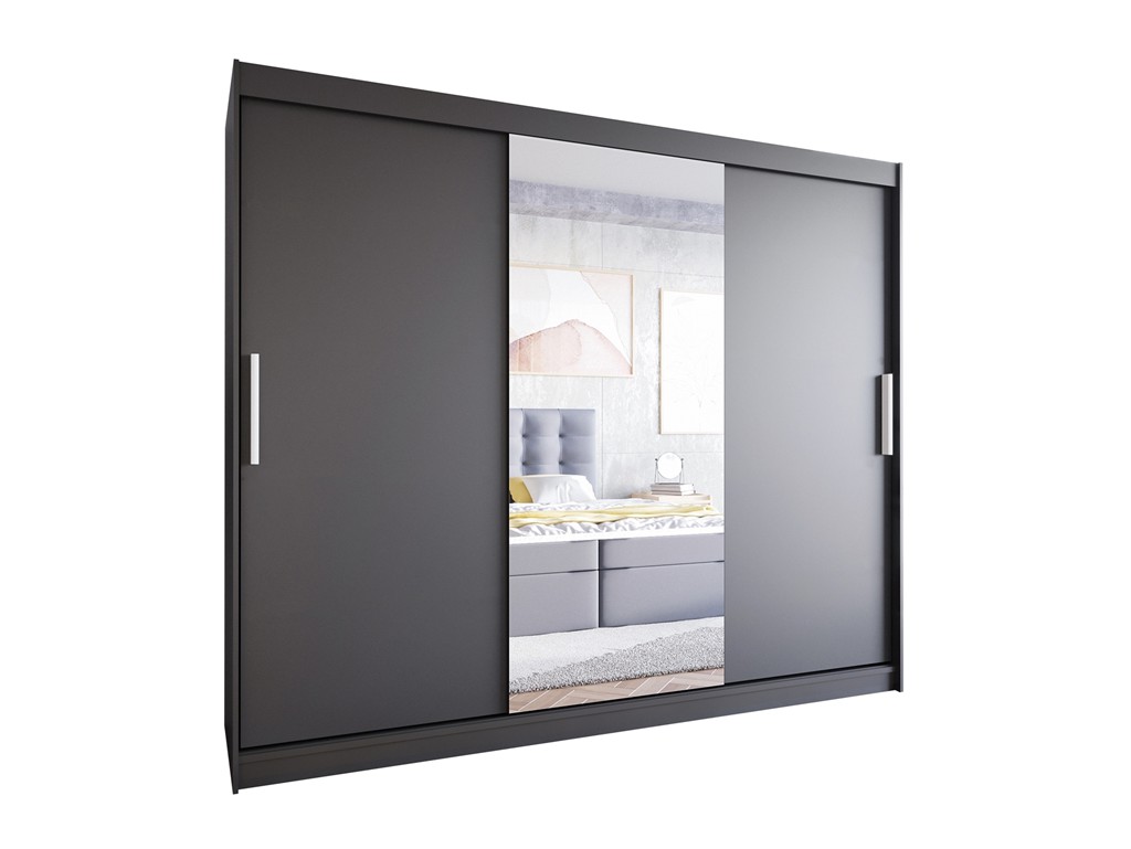 Szafa Lolo I czarny mat 250 to nowoczesna szafa przesuwna z trojgiem drzwi, w tym centralnym lustrem, która wprowadza elegancki ciemny akcent do wnętrza. Pojemne wnętrze z półkami i drążkiem ułatwia organizację garderoby, a gładkie fronty zapewniają minimalistyczny wygląd. Idealna do sypialni, pokoju dziennego lub garderoby, dostarczana w paczkach do samodzielnego montażu.