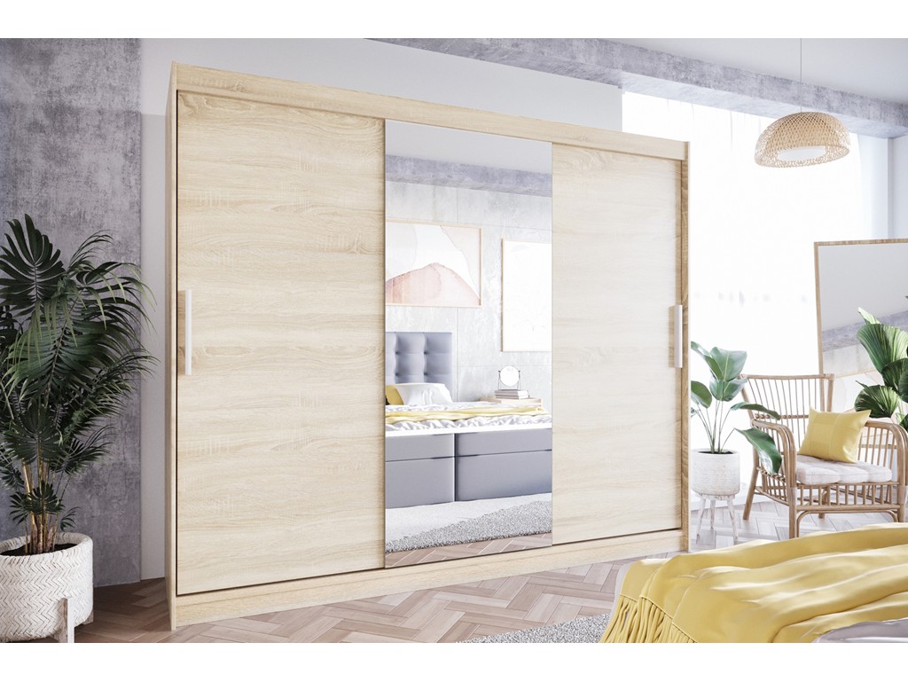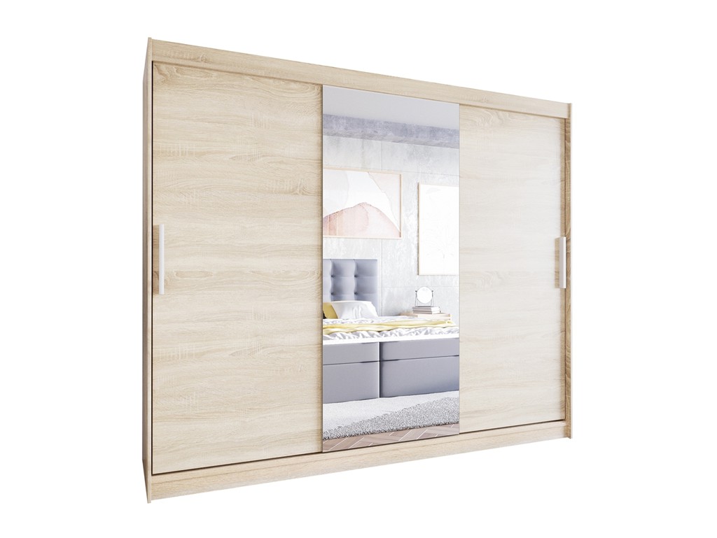 Szafa Lolo I 250 w odcieniu sonoma to pojemna szafa przesuwna z gładkimi frontami i centralnym lustrem, idealna do sypialni, garderoby lub pokoju dziennego. Troje drzwi przesuwnych zapewnia wygodny dostęp do wnętrza, a jasny odcień drewna sonoma wprowadza przytulną atmosferę. Dostawa realizowana jest w paczkach, do samodzielnego montażu. ⟵Zobacz całą kolekcję szaf Lolo