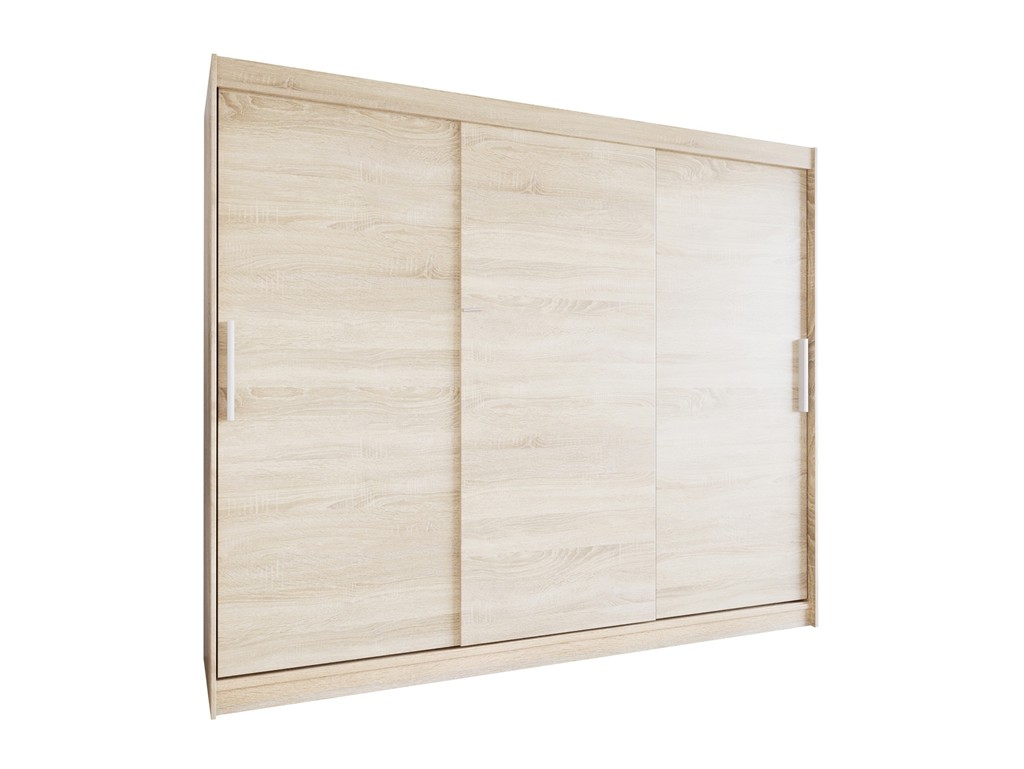 Szafa przesuwna Lolo II w kolorze sonoma to funkcjonalny mebel o szerokości 250 cm, który łączy prostą formę z praktycznym układem wnętrza. Troje drzwi przesuwnych i jasny dekor drewna ocieplają przestrzeń, zapewniając wygodne przechowywanie ubrań i dodatków. Model dostarczany jest w paczkach do samodzielnego montażu.