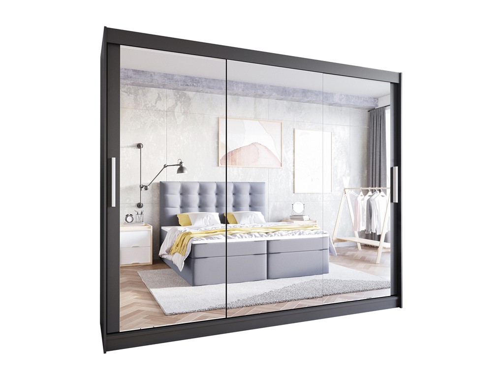 Szafa Lolo III 250 czarny mat nadaje wnętrzu nowoczesny charakter, a lustra optycznie powiększają przestrzeń.