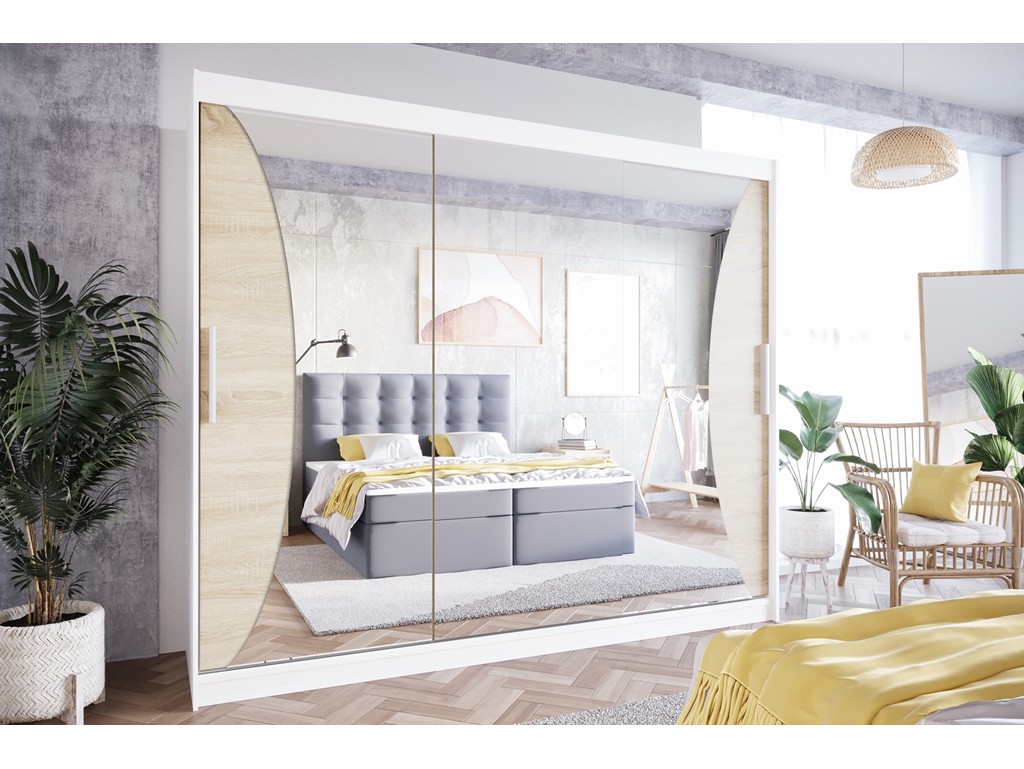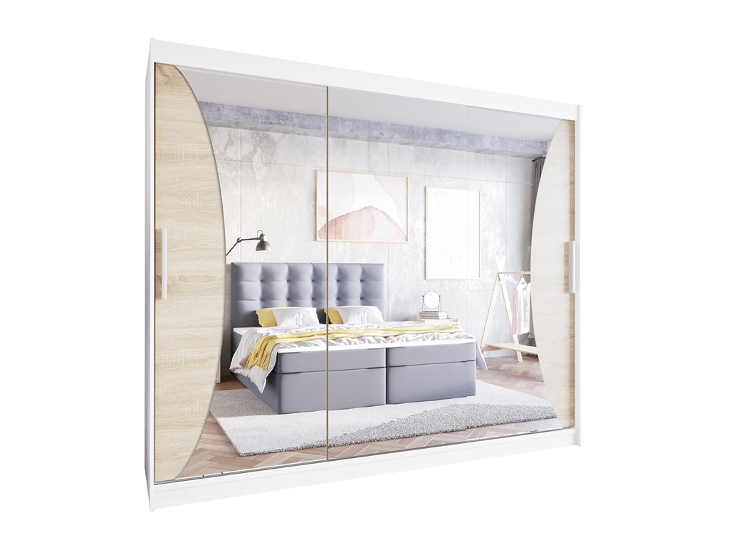 Szafa Lolo IV biały mat/sonoma 250 to nowoczesna szafa przesuwna z jasnymi frontami lustrzanymi, które optycznie powiększają wnętrze. Troje drzwi przesuwnych zapewnia wygodny dostęp do przestronnego wnętrza z półkami i drążkiem na ubrania wiszące. Produkt dostępny z opcjonalnym oświetleniem LED, szybki montaż i Polska produkcja. ⟵Zobacz całą kolekcję szaf Lolo