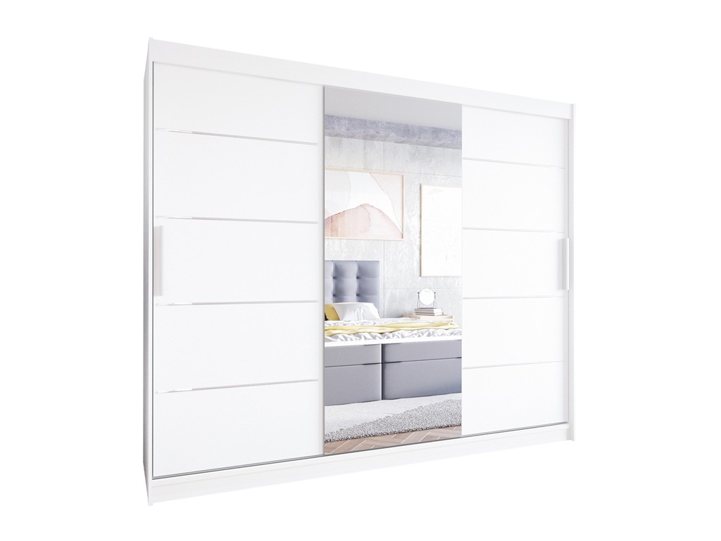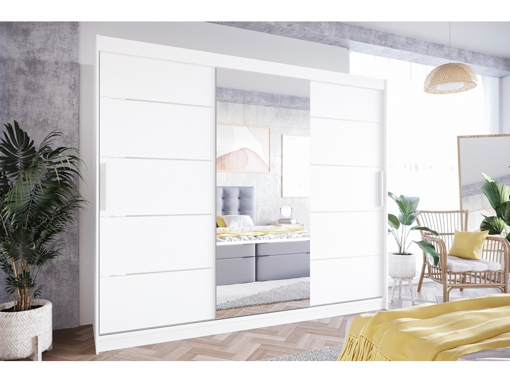 Szafa przesuwna Lolo VI biały mat 250 to przestronny mebel do nowoczesnej sypialni. Troje drzwi przesuwnych z lustrem optycznie powiększają wnętrze, a funkcjonalne półki i drążek na wieszaki pomagają utrzymać porządek. Opcjonalne oświetlenie LED zwiększa komfort użytkowania i pozwala na stylową aranżację.