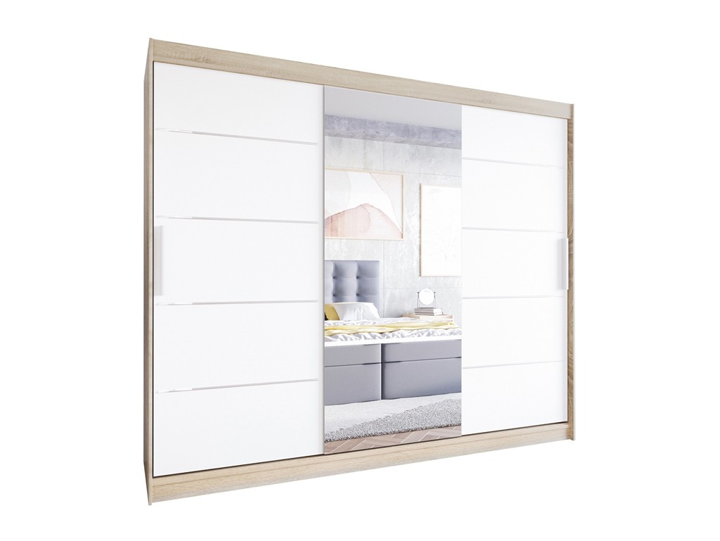 Szafa Lolo VI 250 sonoma/biały mat to przestronna szafa przesuwna łącząca elegancję z funkcjonalnością. Troje drzwi przesuwnych ułatwiają dostęp do wnętrza, które pomieści dużą ilość odzieży i dodatków. Lustro na froncie optycznie powiększa przestrzeń i dodaje praktyczności w codziennym użytkowaniu.
