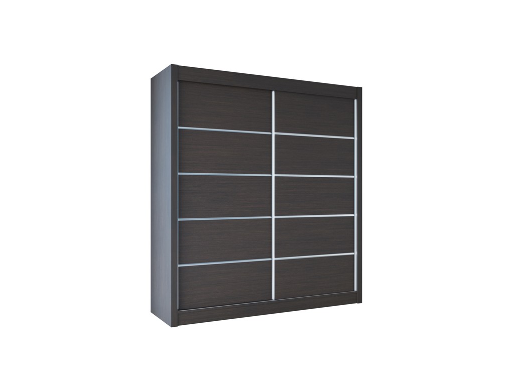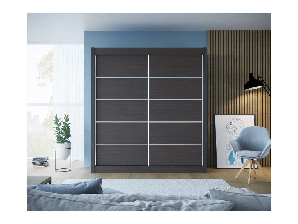 Szafa Bueno 180 choco to nowoczesna szafa przesuwna w głębokim, ciepłym odcieniu drewna, ozdobiona szprosami. na frontach. Doskonale wpisuje się w przytulne i eleganckie wnętrza, oferując funkcjonalne rozwiązania do przechowywania. To szafa, która skutecznie organizuje przestrzeń i jednocześnie podnosi jej wizualny standard. ⟵Zobacz całą kolekcję szaf Bueno