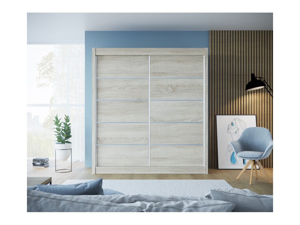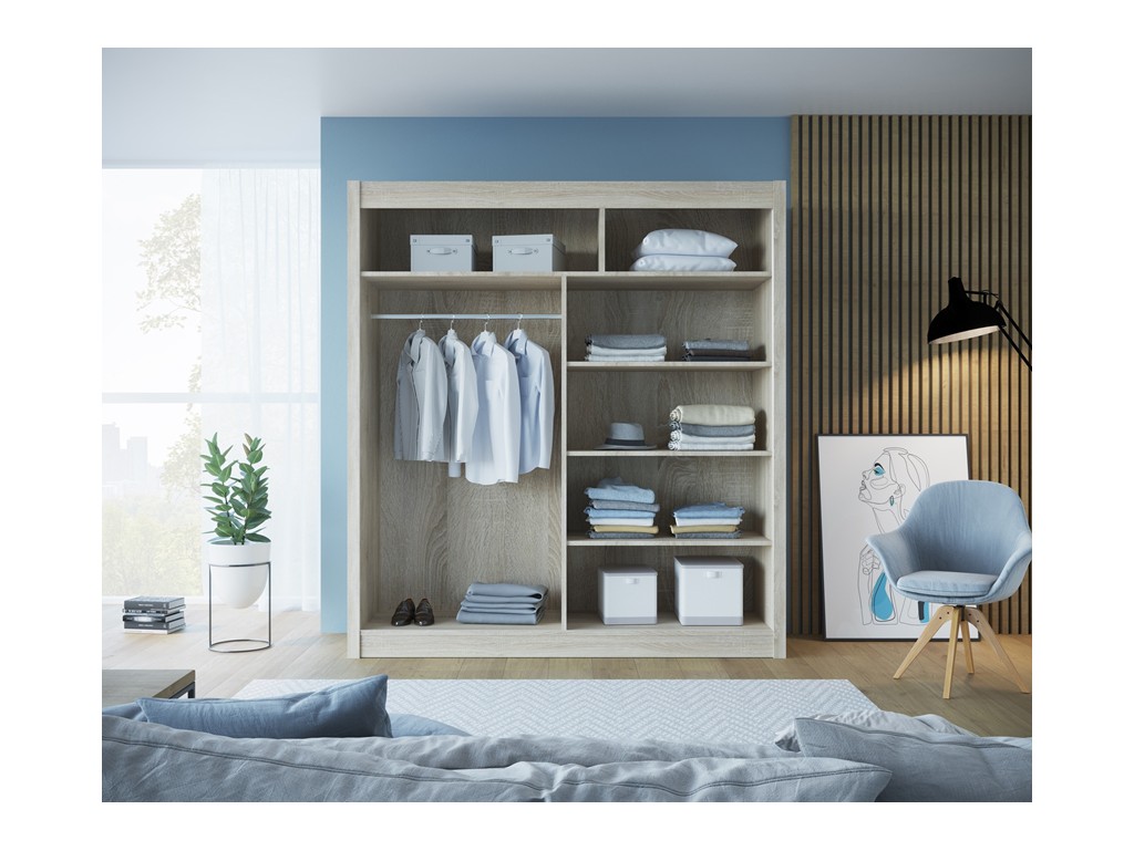 Szafa Bueno 180 sonoma to nowoczesna szafa przesuwna w naturalnym dekorze drewna, która łączy eleganckie wykończenie frontów z poziomymi szprosami. Duża pojemność i przemyślany układ półek sprawiają, że mebel jest praktycznym centrum przechowywania w sypialni, garderobie lub przedpokoju. Dostawa odbywa się w paczkach, z instrukcją do samodzielnego montażu. ⟵Zobacz całą kolekcję szaf Bueno
