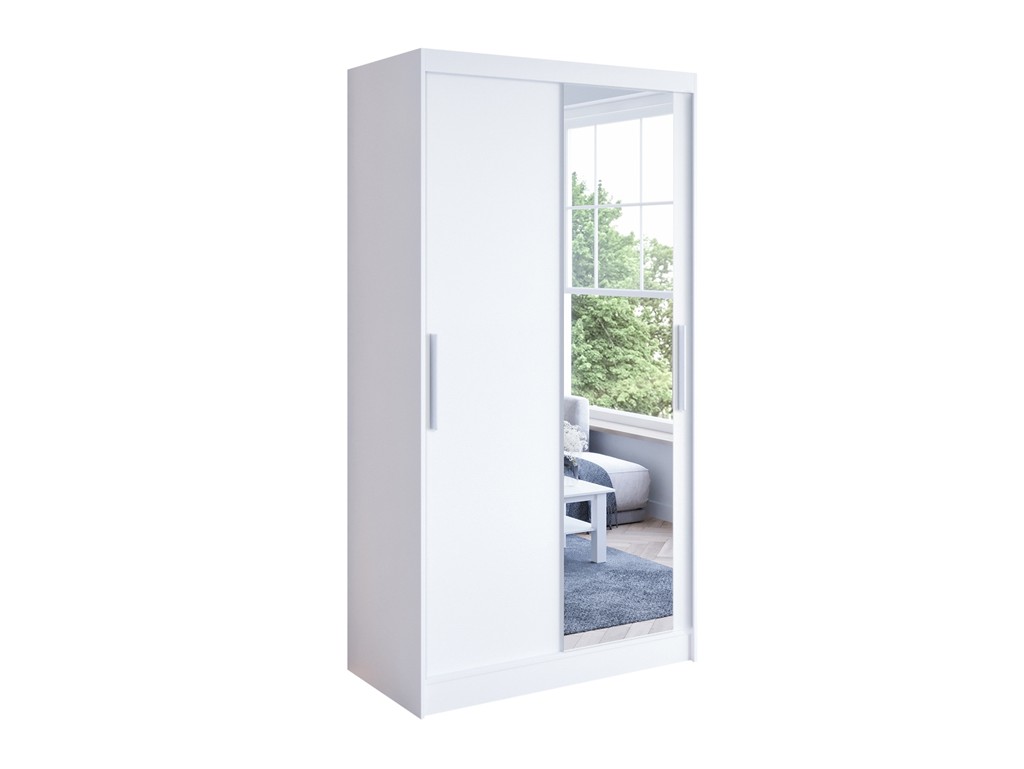 Szafa przesuwna Kalo VI 100 biała to jasny, minimalistyczny model do nowoczesnych wnętrz. Lustro na froncie rozświetla przestrzeń, a system drzwi przesuwnych SEVROLL ułatwia dostęp do pojemnego wnętrza z półkami i drążkiem. Idealna do małych i dużych sypialni, szybki montaż w zestawie. ⟵Zobacz całą kolekcję szaf Kalo