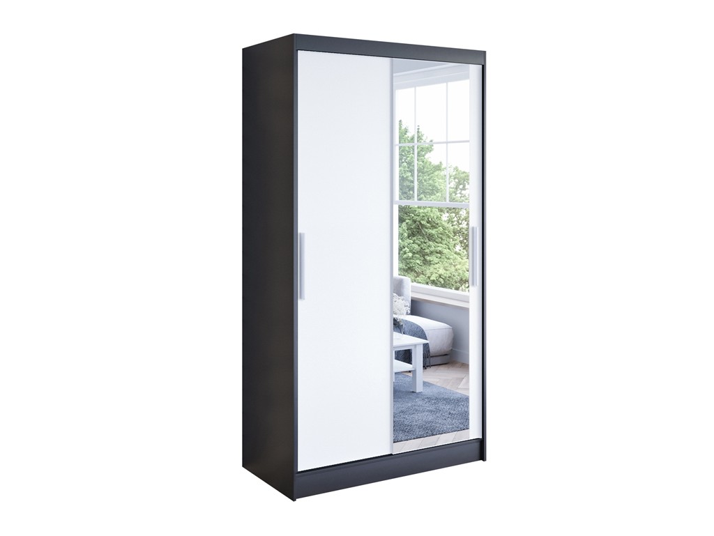 Szafa przesuwna Kalo VI 100 czarny/biały mat to nowoczesny mebel o kontrastowym designie, idealny do garderoby lub pokoju. Lustro na jednym froncie optycznie powiększa przestrzeń, a dwudrzwiowy system przesuwny ułatwia dostęp do wnętrza z półkami, przegrodami i drążkiem. Produkt dostępny z szybką dostawą i montażem we własnym zakresie. ⟵Zobacz całą kolekcję szaf Kalo