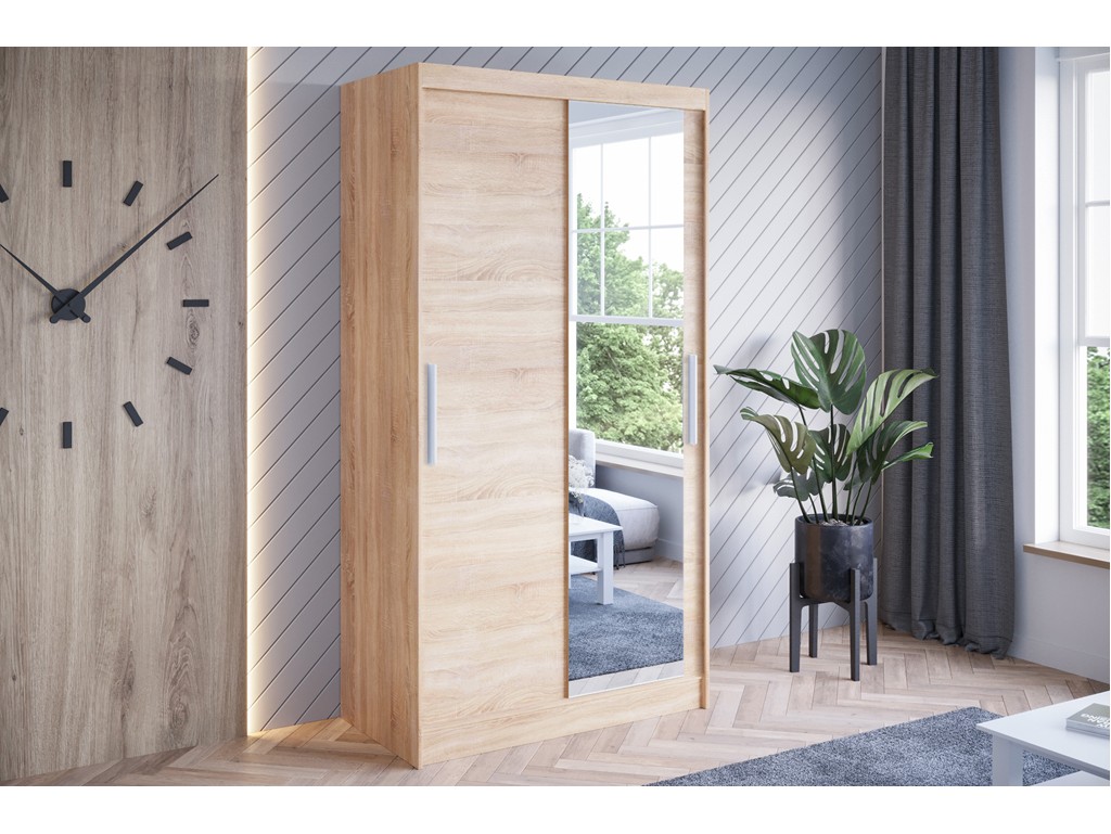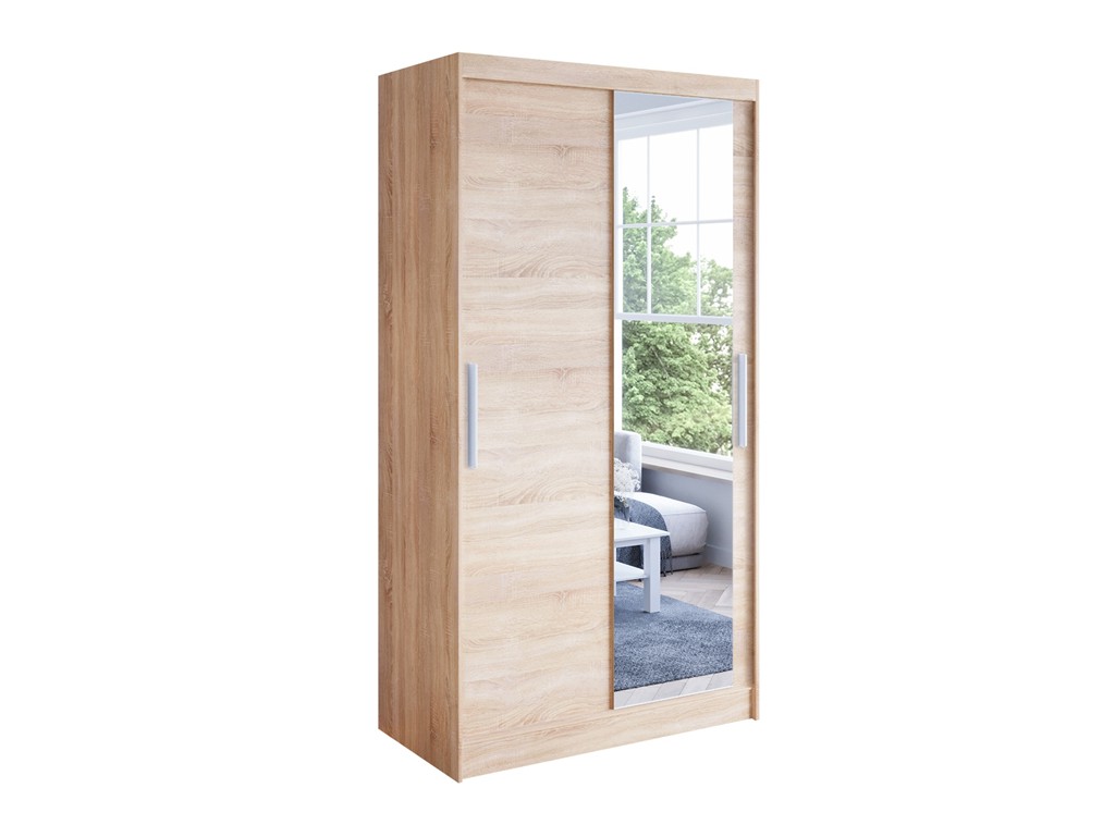 Szafa przesuwna Kalo VI 100 sonoma łączy funkcjonalność z naturalnym, jasnym wybarwieniem drewna. Lustro na jednym froncie optycznie powiększa przestrzeń, a dwudrzwiowy system przesuwny SEVROLL zapewnia wygodny dostęp do wnętrza, które pomieści ubrania, dodatki i akcesoria, utrzymując porządek w pomieszczeniu. ⟵Zobacz całą kolekcję szaf Kalo