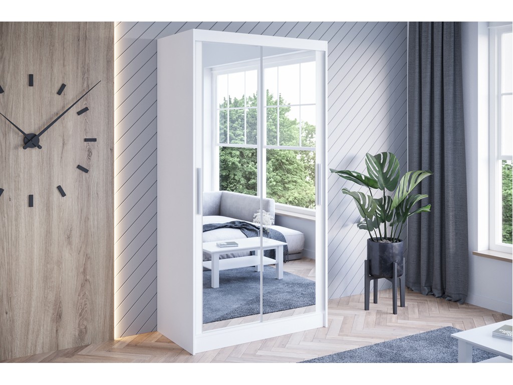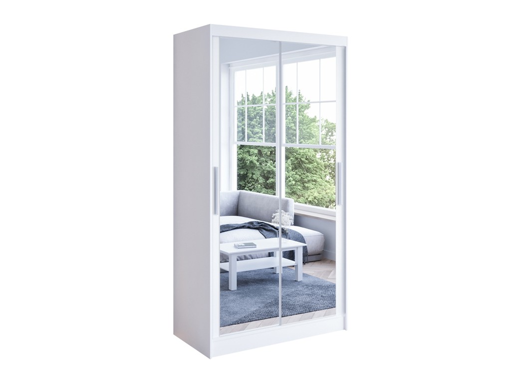 Szafa przesuwna Kalo VII 100 biały to nowoczesny i funkcjonalny mebel do minimalistycznych wnętrz. Jasny kolor frontów w połączeniu z lustrem na jednym froncie optycznie powiększa przestrzeń, a dwudrzwiowy system przesuwny umożliwia wygodne korzystanie z wnętrza pełnego półek, przegrod i drążka na wieszaki. Dostawa w 5-12 dni. ⟵Zobacz całą kolekcję szaf Kalo