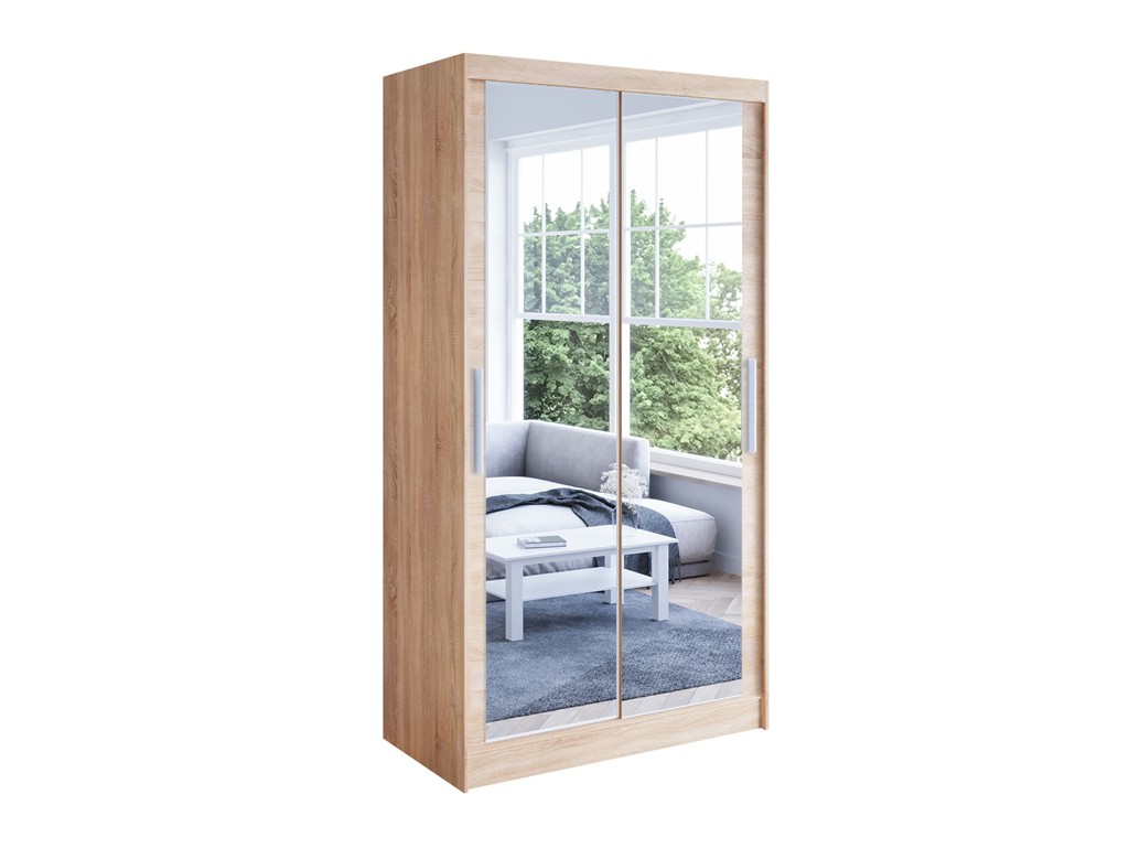Szafa przesuwna Kalo VII 100 sonoma to funkcjonalny mebel do sypialni lub przedpokoju. Jasne fronty w naturalnym odcieniu drewna i lustro na froncie optycznie powiększają przestrzeń, a dwie przesuwne skrzydła ułatwiają dostęp do wnętrza. Produkt jest dostarczany w paczkach do samodzielnego montażu, z kompletem okuć i instrukcją. ⟵Zobacz całą kolekcję szaf Kalo