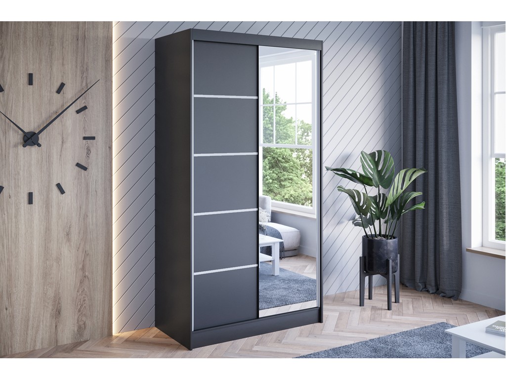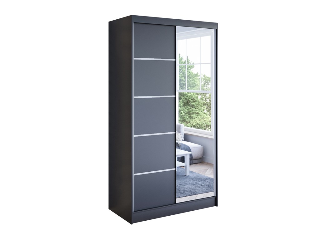Szafa przesuwna Neto III 100 czarna to elegancka szafa z lustrem, idealna do nowoczesnej sypialni lub pokoju. Czarny kolor nadaje wnętrzu wyrazisty charakter, a wbudowane lustro rozświetla przestrzeń i pełni funkcję praktyczną. Wnętrze z półkami i drążkiem zapewnia wygodne przechowywanie ubrań i akcesoriów, a dostawa jest darmowa. ⟵Zobacz całą kolekcję szaf Neto