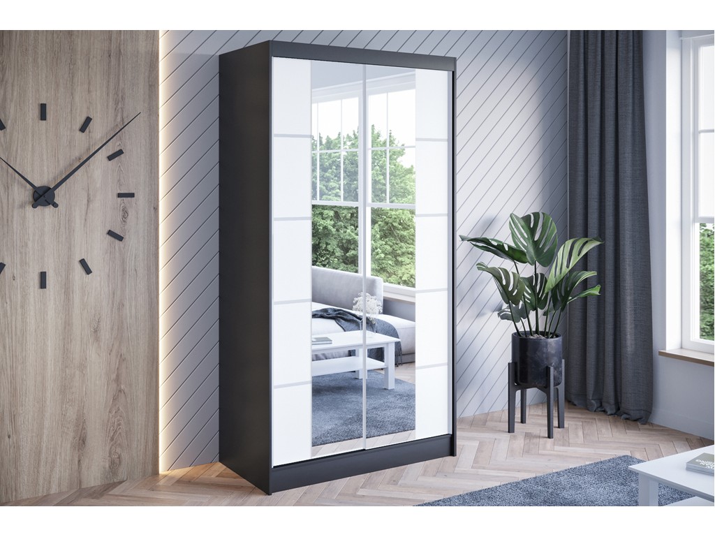 Szafa przesuwna Neto V 100 w kolorystyce czarny/biały mat to nowoczesny, kompaktowy model idealny do małych i średnich pomieszczeń. Kontrastowe połączenie frontów z lustrem i ciemnego korpusu podkreśla minimalistyczny styl wnętrza, jednocześnie zapewniając wygodną organizację odzieży. Dwudrzwiowy system przesuwny ułatwia użytkowanie nawet w wąskich przestrzeniach.