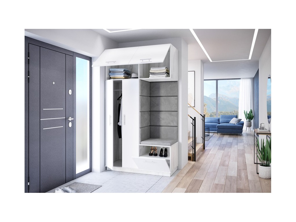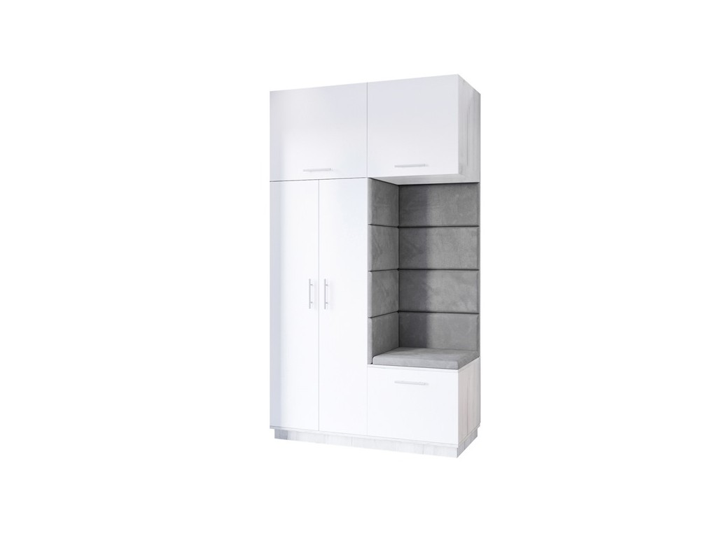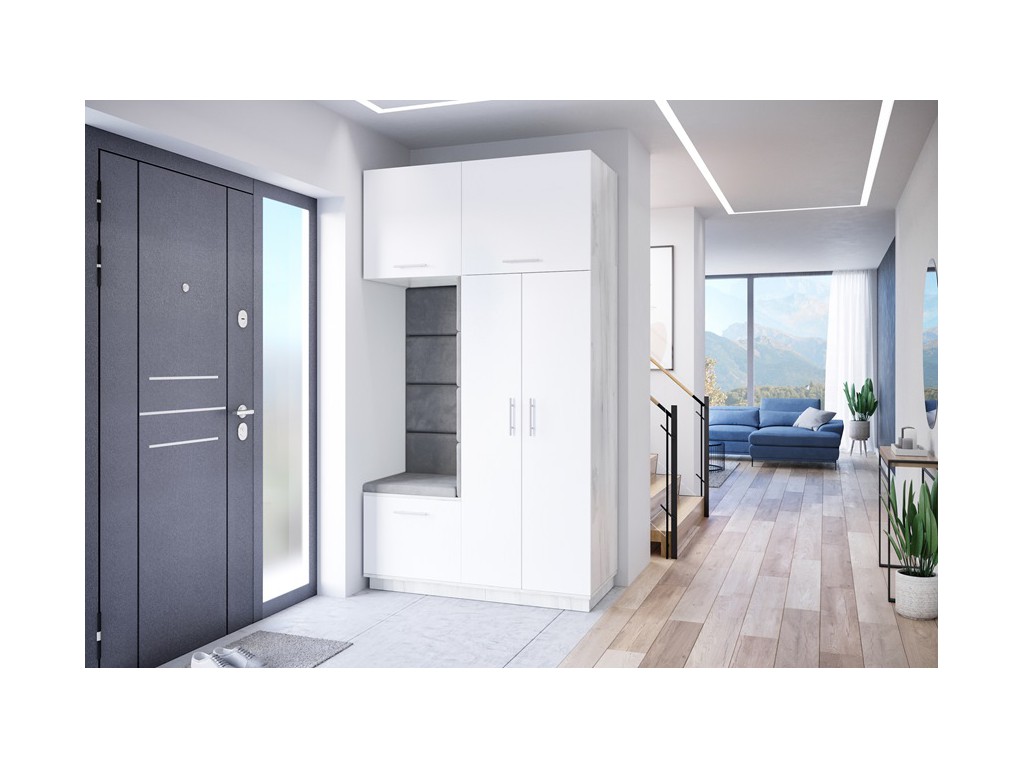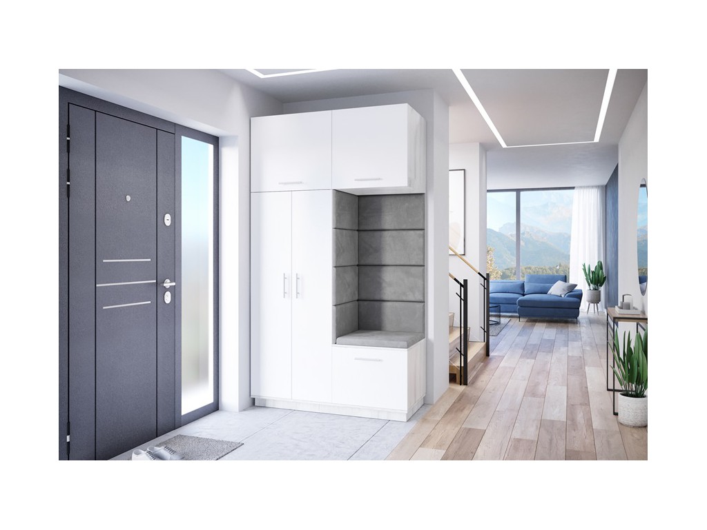 Garderoba Milo 4 w rozmiarze 150 cm z korpusem w kolorze biały Craft i białym, matowym froncie to ponadczasowa, pojemna szafa do korytarza, która łączy elegancję z funkcjonalnością. Tapicerowana wnęka z przeszyciami zapewnia komfortowe siedzenie przy zakładaniu obuwia i nadaje wnętrzu przytulny charakter.