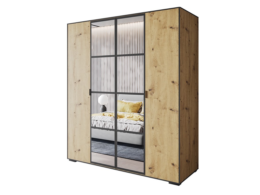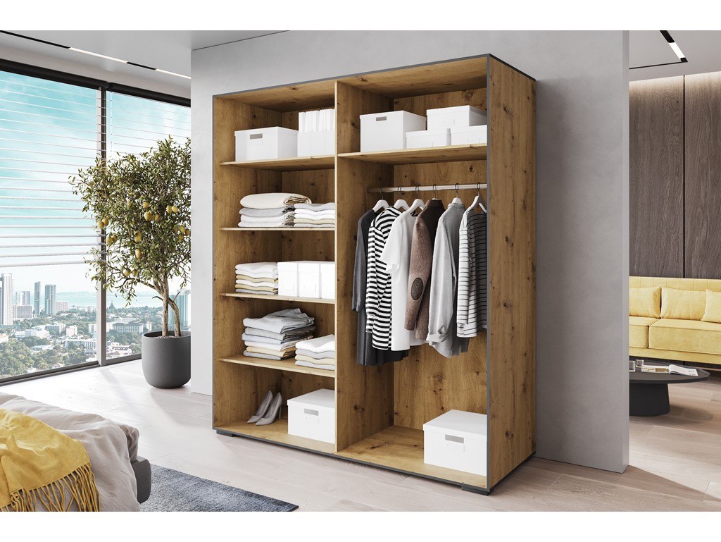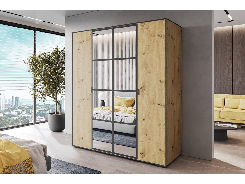 Szafa uchylna Solo 1 180 artisan łączy przestronność z industrialnym stylem loftowym. Cztery drzwi uchylne i loftowe lustra w ciemnych ramach ułatwiają dostęp i optycznie powiększają wnętrze. Przemyślany układ półek, przegrody i drążki zapewnia wygodne przechowywanie odzieży w większych sypialniach i garderobach.