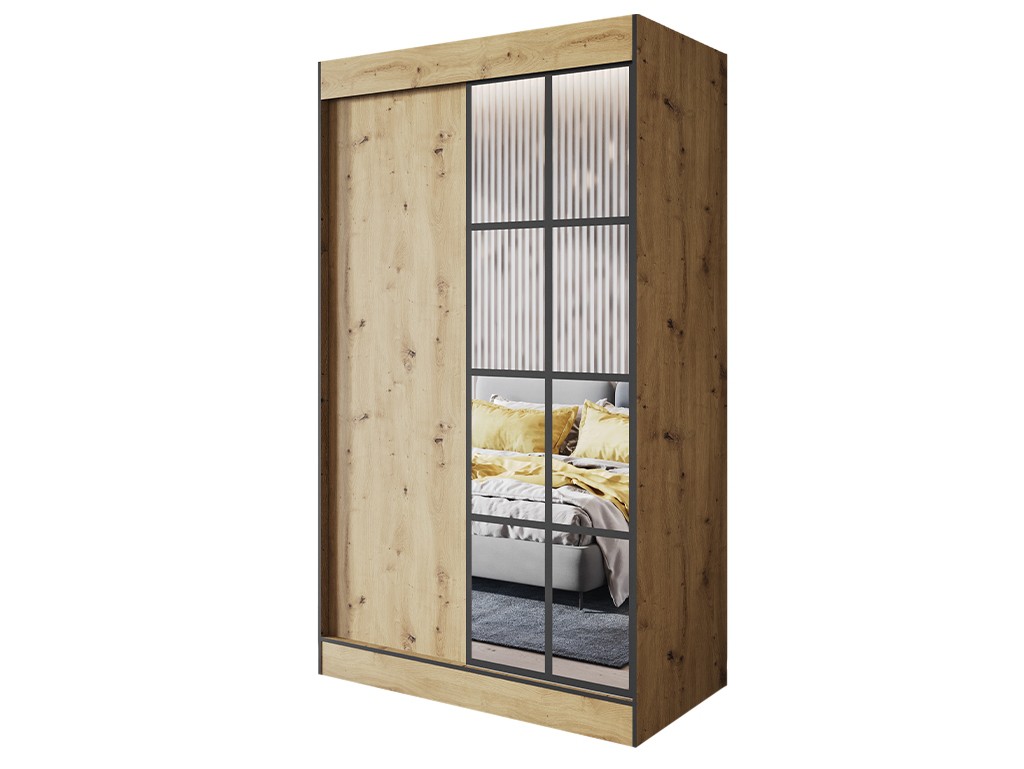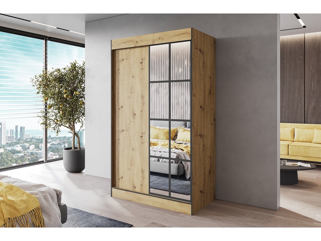 Szafa przesuwna Solo 2 120 artisan łączy kompaktowe wymiary z loftowym stylem. Dwudrzwiowa konstrukcja z lustrem w ciemnych ramach optycznie powiększa przestrzeń i wprowadza nowoczesny charakter do sypialni, pokoju dziecka lub przedpokoju. Funkcjonalne wnętrze z półkami i drążkiem pozwala wygodnie przechowywać ubrania, a dostawa odbywa się w paczkach do samodzielnego montażu.⟵Zobacz całą kolekcję szaf Solo