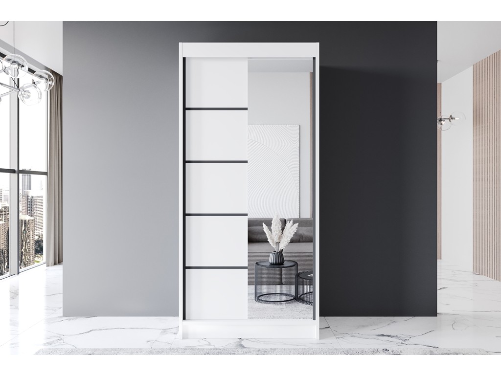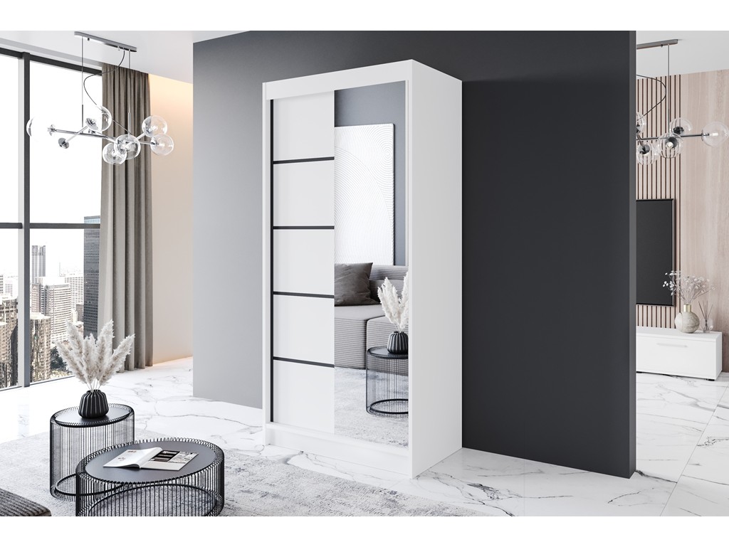 Szafa przesuwna Prim III 100 biały mat z czarnymi wstawkami to minimalistyczny mebel do sypialni lub przedpokoju, który optycznie powiększa przestrzeń. Kompaktowa forma i ergonomiczny układ półek oraz drążka na wieszaki pozwalają maksymalnie wykorzystać każdy centymetr. Dostawa realizowana jest standardowo w ciągu 5-12 dni. ⟵Zobacz całą kolekcję szaf Prim