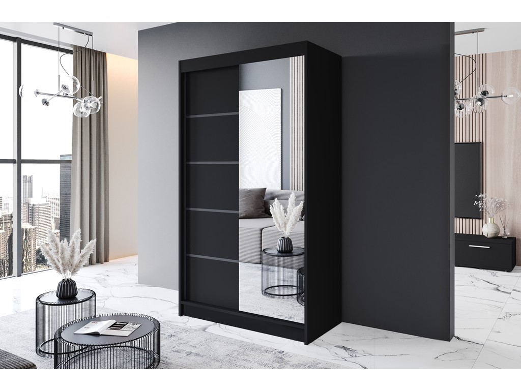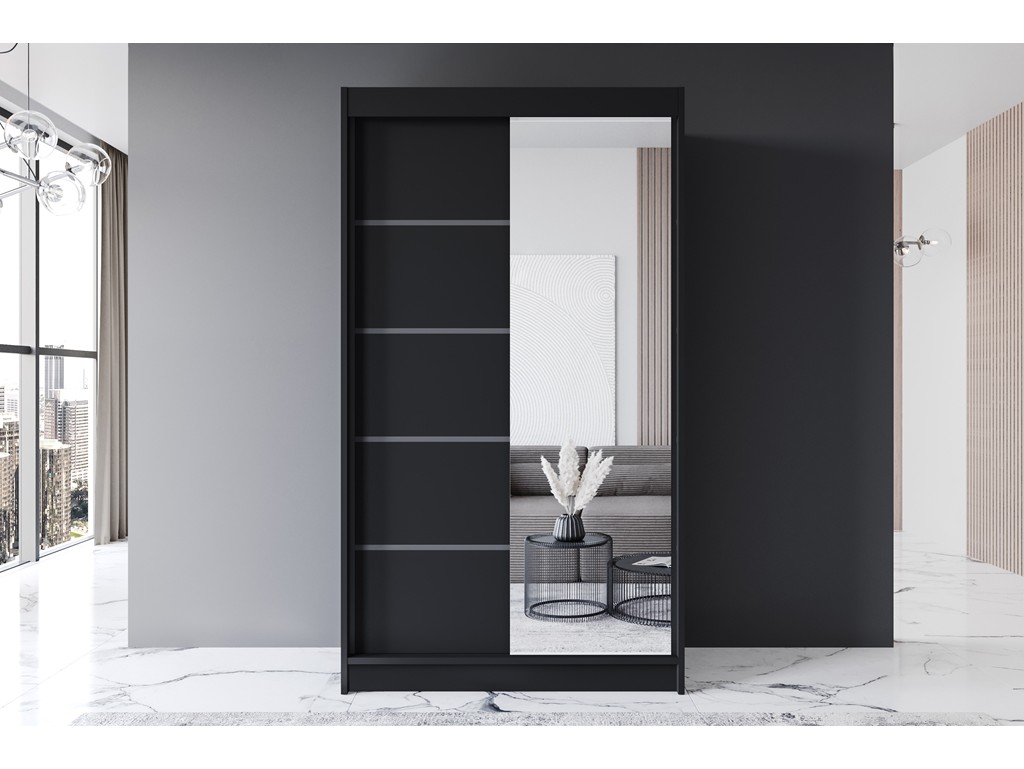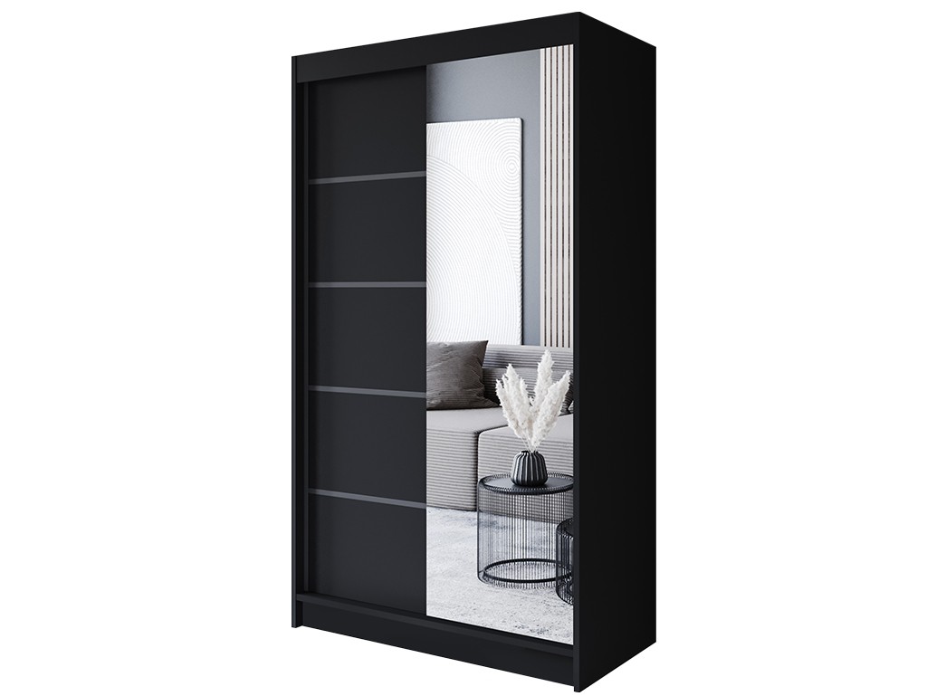 Szafa przesuwna Prim III 120 czarny mat z lustrem to minimalistyczny mebel do nowoczesnej sypialni, przedpokoju lub pokoju dziecięcego. Lustro optycznie powiększa przestrzeń, a kompaktowe wymiary pozwalają na wygodne dopasowanie w mniejszych wnętrzach. Produkt dostępny z opcją montażu dodatkowego LED.