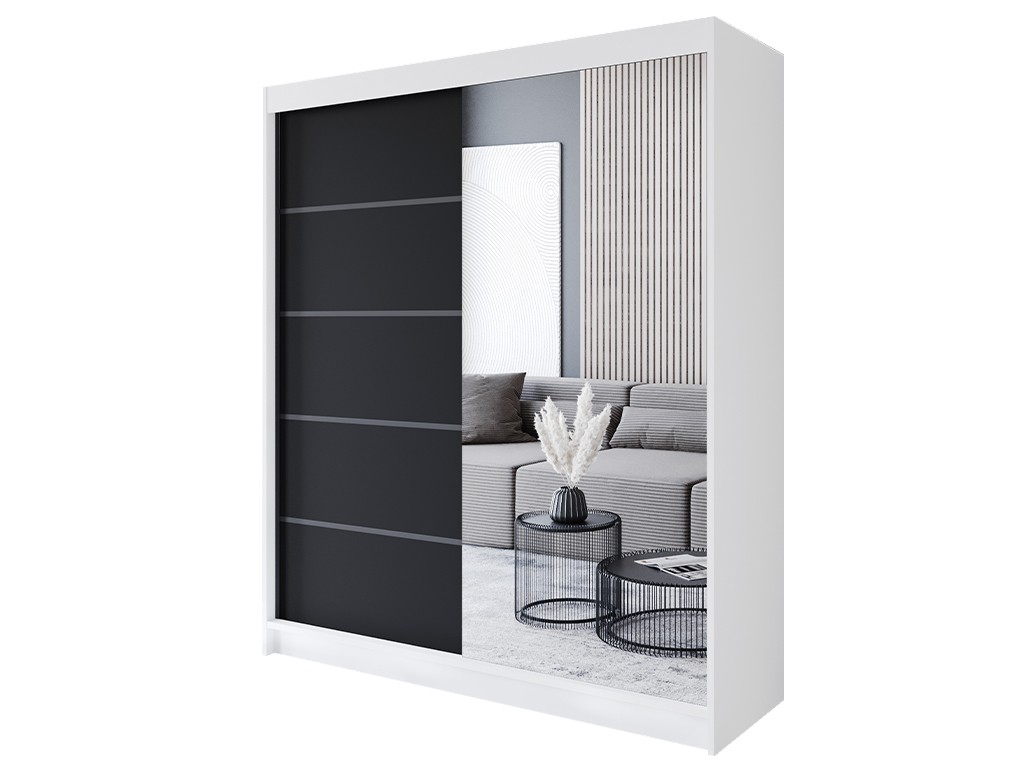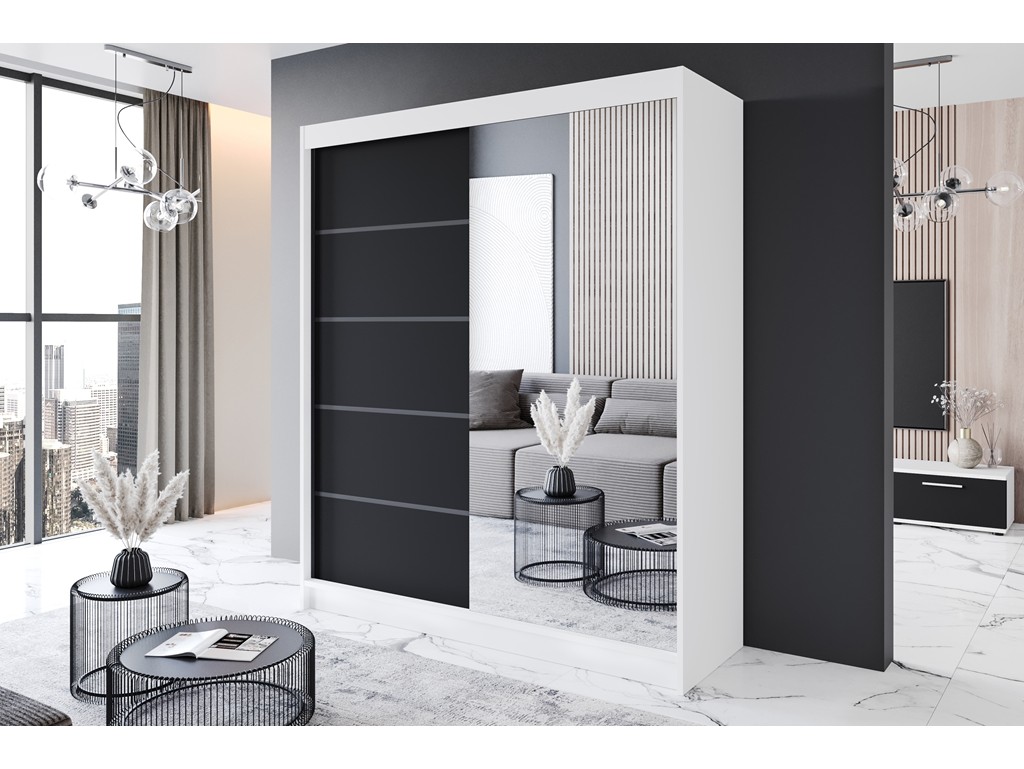 Szafa przesuwna Prim III 180 biały/czarny mat łączy nowoczesny kontrast kolorów z praktycznym przechowywaniem. Biały korpus i czarne fronty z wstawkami w czarnym macie wprowadzają elegancki akcent, który optycznie powiększa przestrzeń. Idealna do sypialni, pokoju dziecka lub przedpokoju, z szybką dostawą w Polsce.