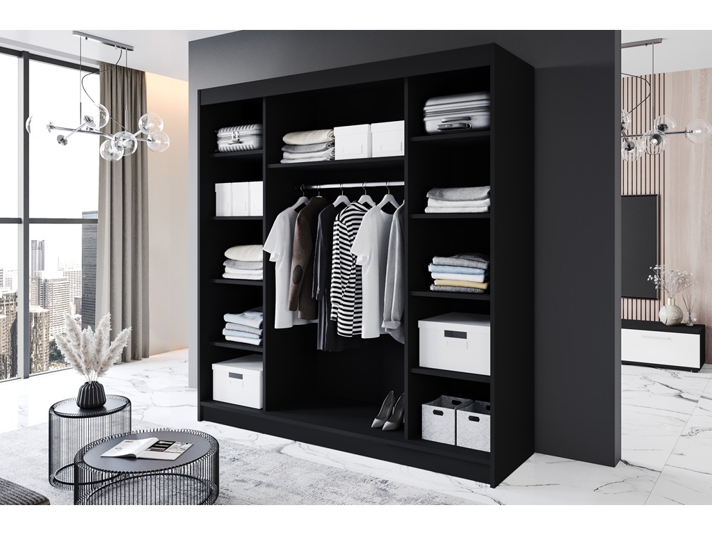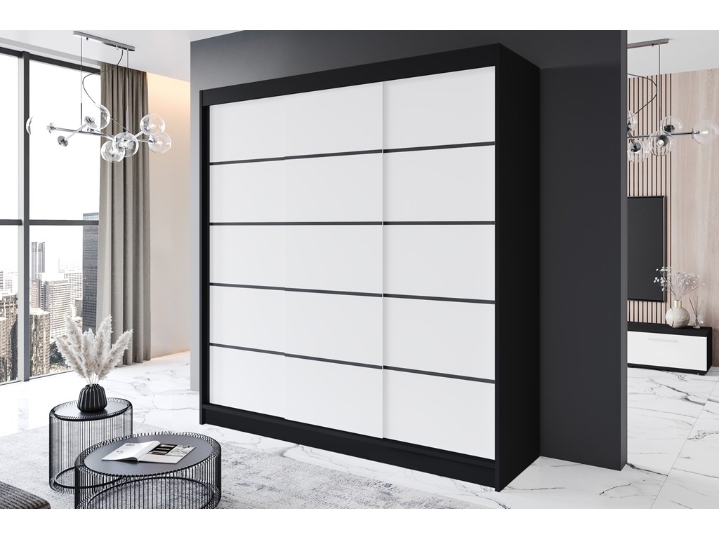 Szafa Rimi VII 200 czarny/biały mat to kompaktowa i nowoczesna szafa przesuwna, która sprawdzi się w mniejszych sypialniach lub garderobach. Dwa przesuwne drzwi zapewniają wygodny dostęp do wnętrza, a półki i drążek umożliwiają funkcjonalną organizację odzieży. Kontrast czerni i bieli wprowadza elegancki i nowoczesny akcent do wnętrza. ⟵Zobacz całą kolekcję szaf Rimi