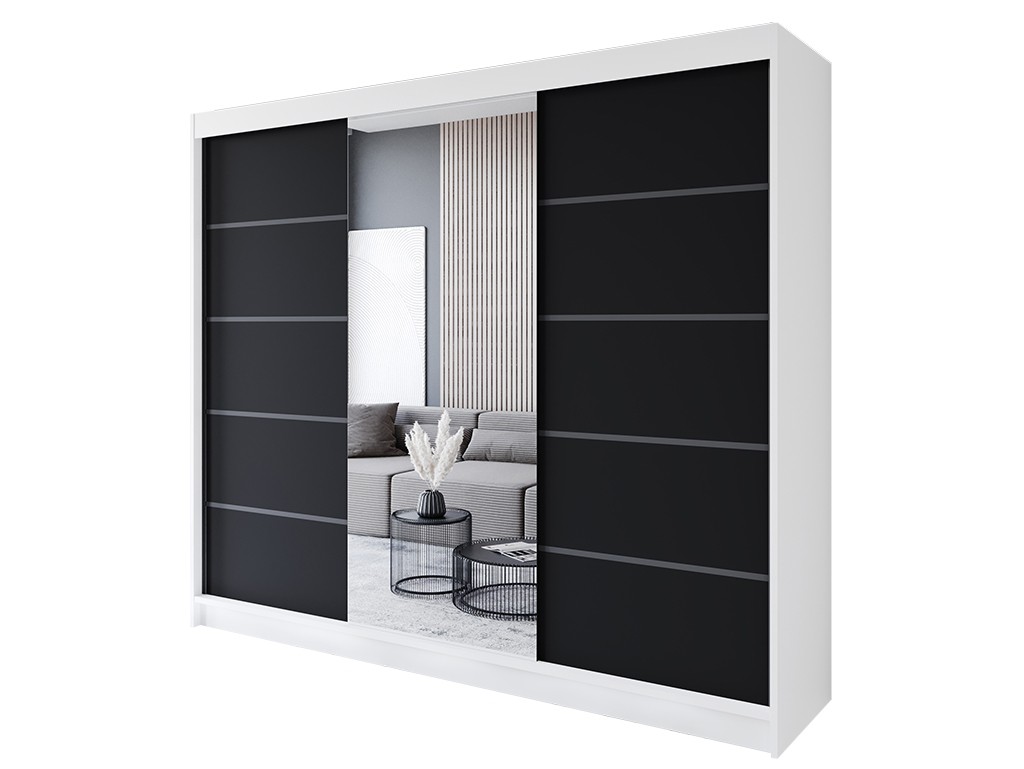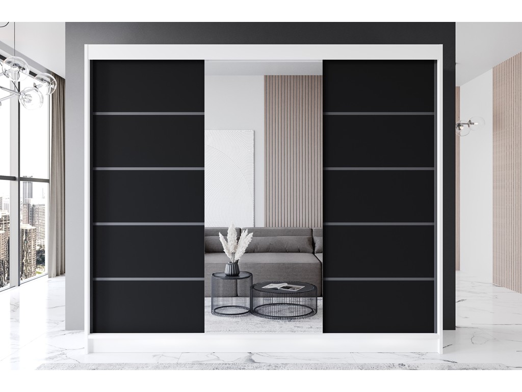 Szafa przesuwna Rimi VI 250 biały/czarny mat to nowoczesny i funkcjonalny mebel, idealny do sypialni i garderoby. Trzy przesuwne drzwi umożliwiają wygodny dostęp do wnętrza, a drążek i półki pozwalają utrzymać porządek w odzieży. Uniwersalny design z kontrastem kolorów wpisuje się w różne aranżacje wnętrz.